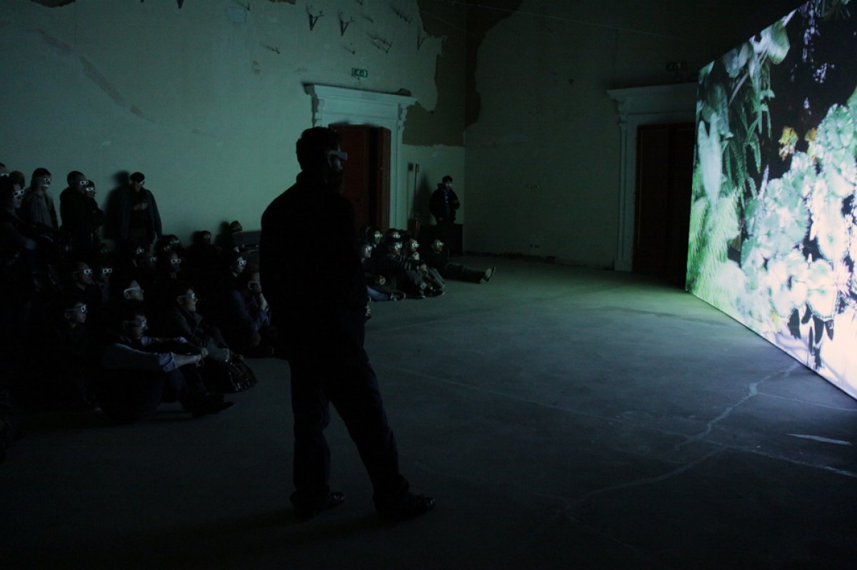 Chiavi in mano is a project composed by two complementary and autonomous units: All Inclusive & Joule. Both works give an interpretation of the complex, ambiguous relationship between the concepts of work, gift and sacrifice. The fish is the project’s symbol, as it is an excellent example of creature that can eat its fellows if they are smaller. Still remaining independent one from the other, the two works (a stereoscopic film and a stereo audiovisual environment) entertain a relation of strong reciprocity and specularity. The migration of the same matters from Joule to All Inclusive investigates on and extends the relationship among vision/time/movement/scene/editing. In All Inclusive the point of view is internal to the scene and vision is a linear flow, always linked to a present time, to the spatial continuity of narration. Joule explodes All Inclusive, in a sort of allegoric representation in which frontality is emphasized. It is just as if in Joule would work the same drive which leads a child to break a clock in order to understand how time works.
