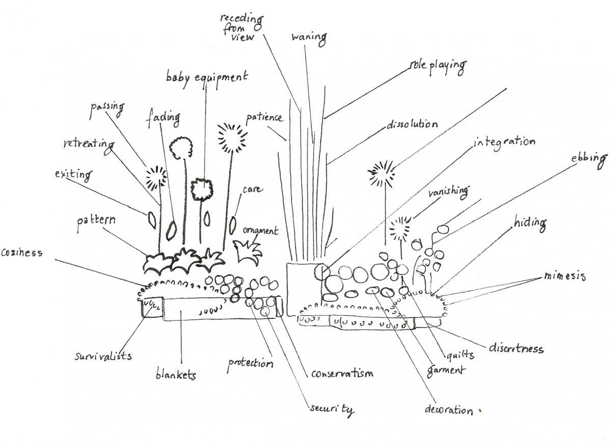 The Fellowship of the Quilted Dance is a preparatory performance for the next creation of Alix Eynaudi, Edelweiss, developed through the investigation of the art of camouflage and the craft of padding and quilting. The multi-faceted artistic team involved in Raum's performance is composed of Alix Eynaudi, choreographer and dancer, the costume and set designer Lise Lendais, the illustrator Cecile Tonizzo and the curator and critique Quim Pujol. While performing together, sharing work and forging bonds - not only metaphorically - they will run through the glossary of Eynaudi's research, ordering them in an associative way between disappearance and invisibility, and ideally travelling through the comfort of a padded security blanket.