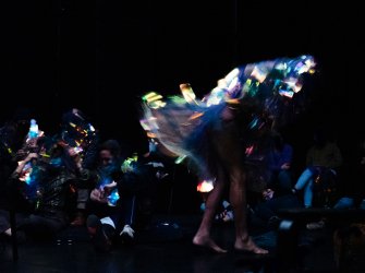 Traditionally, a vigil is a gathering moment permitting to pass through the symbolic threshold that led from the daylight to the night. For this collaboration from both sides of cultures, the french choreographer Latifa Laâbissi and the brasilian choreographer Marcelo Evelin chose to place the conditions of an incarnate vigil: embodied by voices, songs, inhabited by flaming presences and nagging ghosts, where the body is a medium, in touch with the reality of this world. With La Nuit tombe quand elle veut, the performers offer the audience to follow them in a perceptive immersion; crossing an internal experience with three figures on watch - half-look-out, half-pythia. In the company of the musician Tomas Monteiro, whose theremin becomes the amplifier of their imaginary states, their presences mutate, becoming “bodies that see, collect, sediment, cannibalize and bury”. Seeing with a blind eye, they re-imagine cosmogonies, bringing out utopic and insolent reconfigurations, somewhere between rage and enchantment. They allow themselves to be inhabited by visiting spirits, body borrowers, bodies which affect certain images, like fugitive archives. They let these images poison their fiction, like those playing with a chimera’s fire, those who bring together rites to confirm their own existence. Multiplied by the refractive costumes of Nadia Lauro, by the languages they produce, those bodies, swamped with pictures, melt in a tumultuous and malleable substance, in a constant metamorphosis. La Nuit tombe quand elle veut is a deep dive into the idea of time itself.