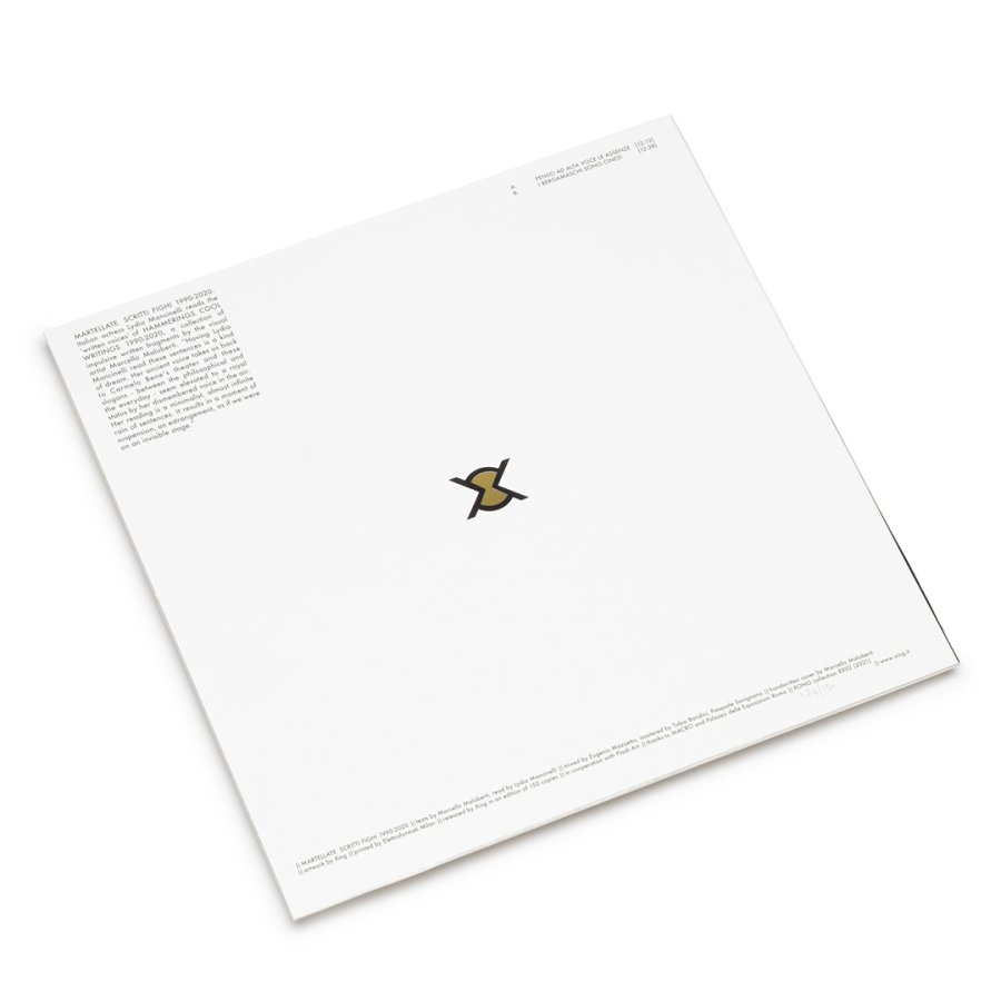 MARTELLATE. SCRITTI FIGHI 1990-2020. LYDIA MANCINELLI LEGGE MARCELLO MALOBERTI (HAMMERINGS. COOL WRITINGS 1990-2020. LYDIA MANCINELLI READS MARCELLO MALOBERTI) is the second release of XONG collection - artist records. Italian actress Lydia Mancinelli, stage and life partner of the avant-guard author Carmelo Bene, reads the “written voices” of MARTELLATE, a collection of impulsive written fragments by the visual artist Marcello Maloberti. The release is on white vinyl, in a limited and numbered edition, along with a series of 30 collector's editions, with handwritten cover by Maloberti.