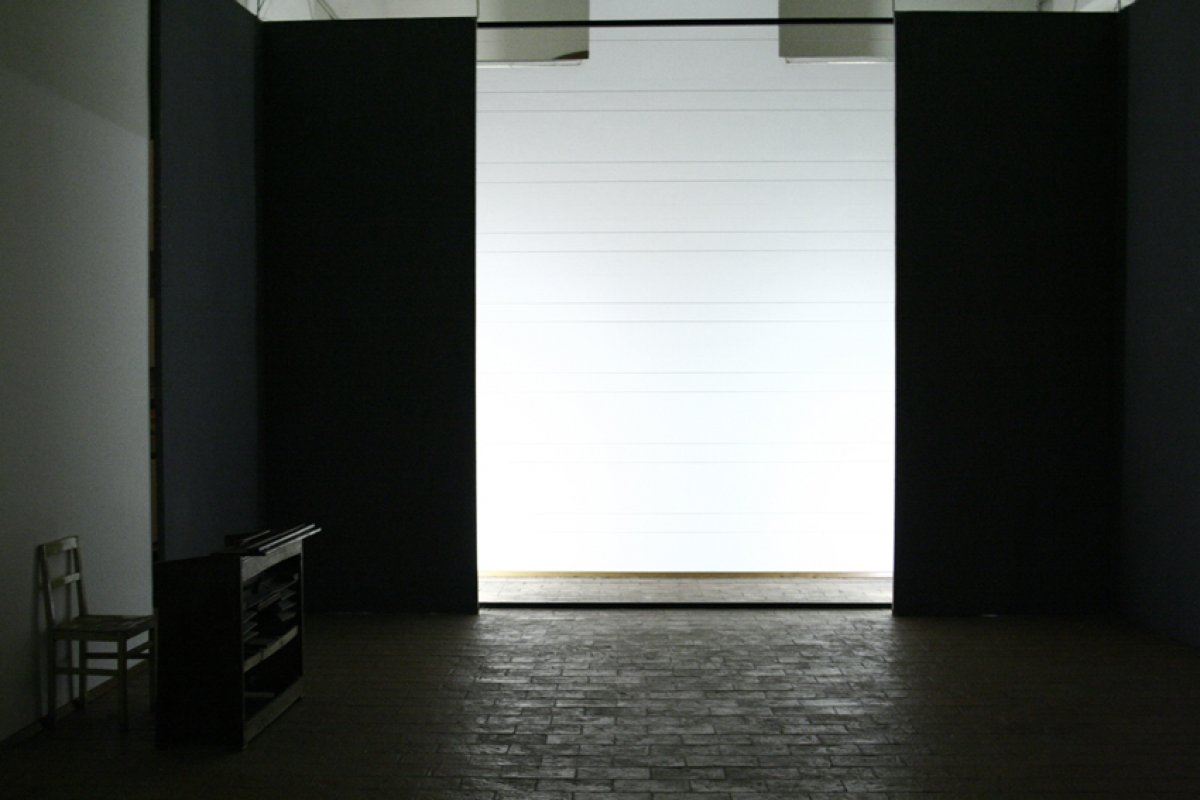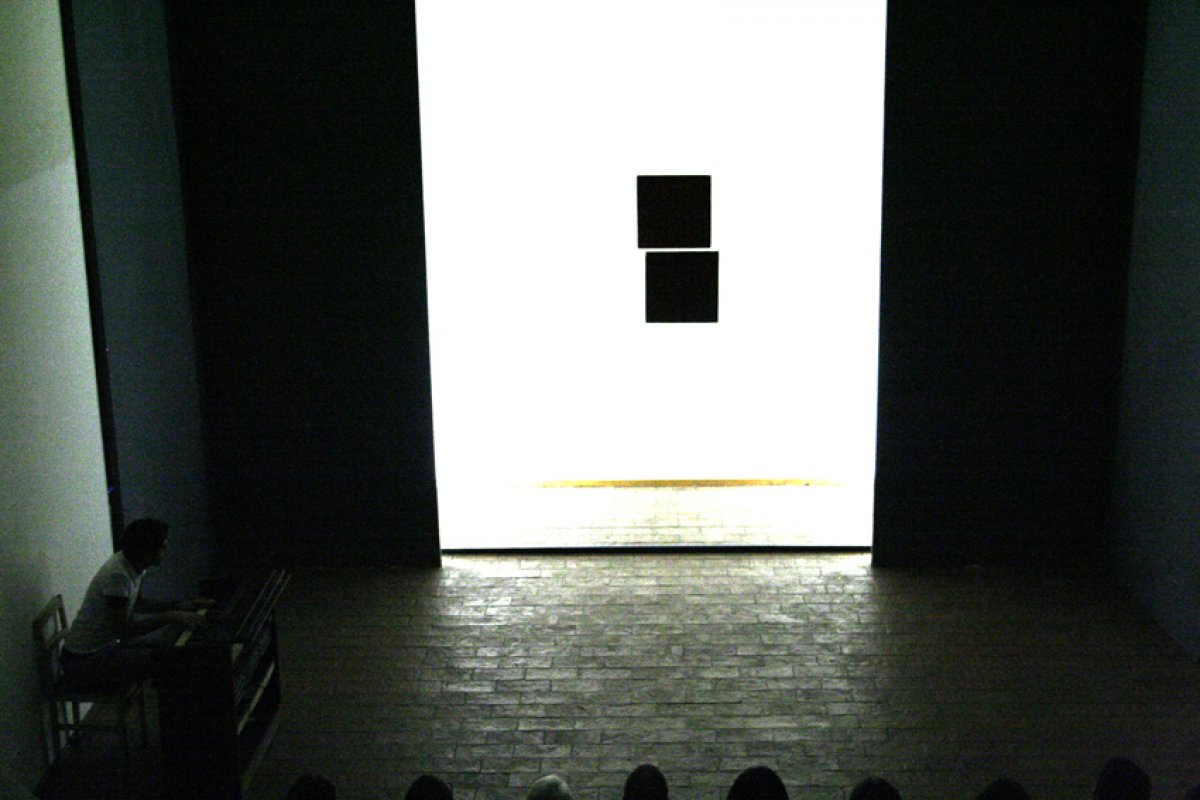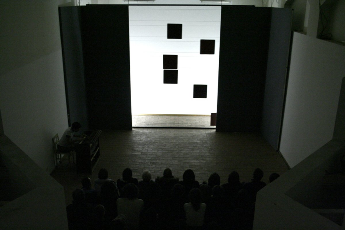 Studi meccanici sulla più piccola distanza, di Pathosformel. Uno spazio destinato a riempirsi e svuotarsi di quadrati colorati che sembrino ogni volta sfiorarsi come cittadini al passaggio in una piazza affollata. Appaiono di continuo per scorrere nuovamente fuori, tessere irrequiete di un mosaico senza figurazione, in un gioco di colori costretto a convivere con l’inquietudine che due quadrati si possano toccare, andando a rompere il meccanismo perfetto.