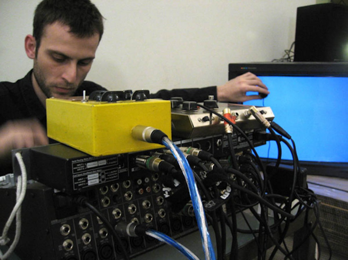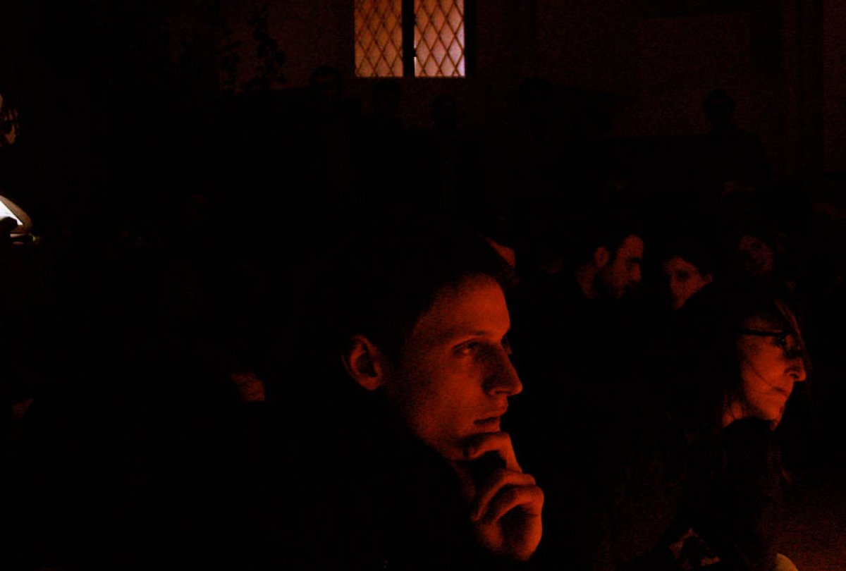 In un formato espanso della durata di 4 ore circa si addenseranno i contributi dei 16 partecipanti dando vita ad una colonna sonora collaborativa della serata; in questo contesto le individualità degli autori saranno motivo di costruzione corale, dove ogni nucleo operativo si muoverà autonomamente nella ridefinizione del bi-spazio-raum. A partire da uno stuolo di ‘punti di attracco’ (ovvero prese della corrente, ciabatte ecc.) in un ambiente completamente buio, gli impianti di amplificazione audio saranno totalmente mobili, definendo le traiettorie individuali; niente sarà possibile all’udito senza il contributo bipede dello spostamento. La vista, da parte sua, non avrà appigli video-visuali: la performatività fisica, la centralità dell’autore che opera sulle proprie strumentazioni, l’intrigo installativo dei cavi e la conseguente riduzione/fantasmaticità estrema dello spazio adibito al pubblico la porteranno a smarrirsi piuttosto che indirizzarla.