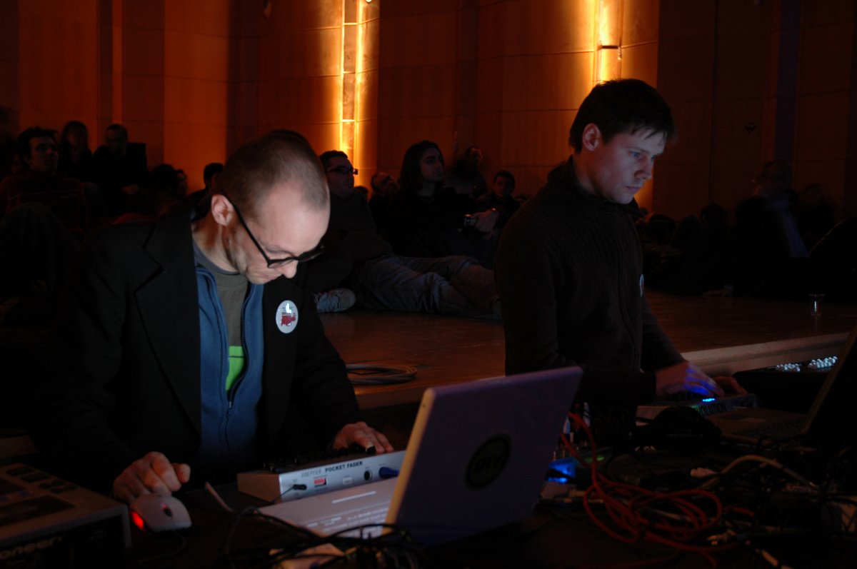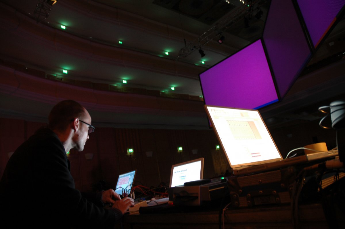 Live Media Floor this year signals a unique return, that of Bas van Koolwijk who, after his participation in Netmage 03, is presenting RGB, together with Christian Toonk. RGB is a performance starting from the three channels making up the perceptual system of video (red, green and blue). The direct transposition of the video signal into sonic frequencies, allows the creation of an audio trace based exclusively on the three chromatic channels on which Christian Toonk intervenes on these with his computer, producing a minimal perceptual sound environment with strong synesthetic interaction.