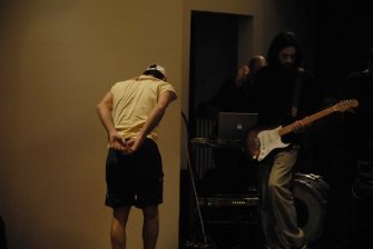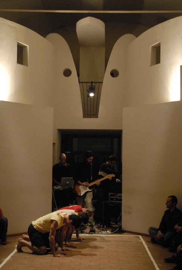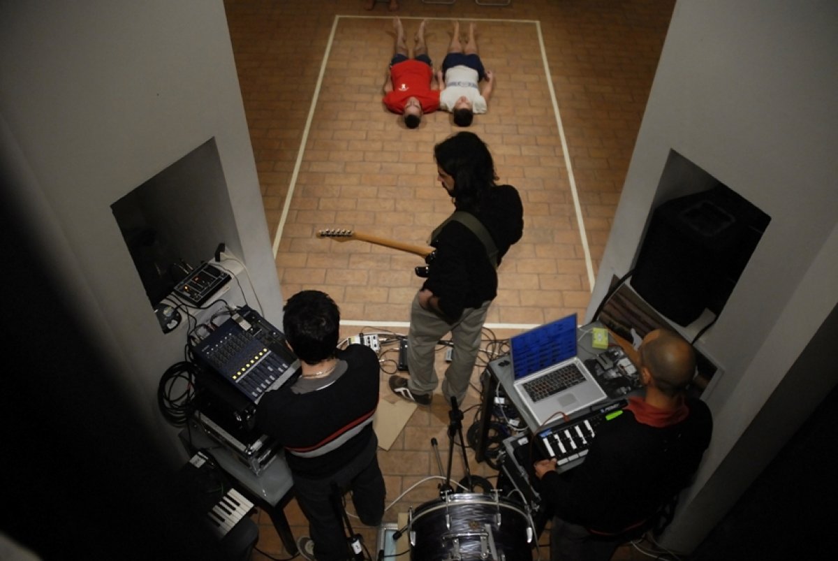 Due spazi attigui e identici ospitano il set dei musicisti da un lato e l’azione performativa dall’altro. Ad ogni pezzo di sinistri succede un’attività silenziosa di mk. La soglia tra i due eventi contigui ha diversi livelli di permeabilità, da quello puramente fisico dei corpi applicati a funzioni diverse, a quello del riverbero tra due diverse scansioni del tempo, che condividono l’oscillazione continua nell’istante, una pulsazione asimmetrica che sostituisce l’idea di ripetizione con quella di ricorrenza.