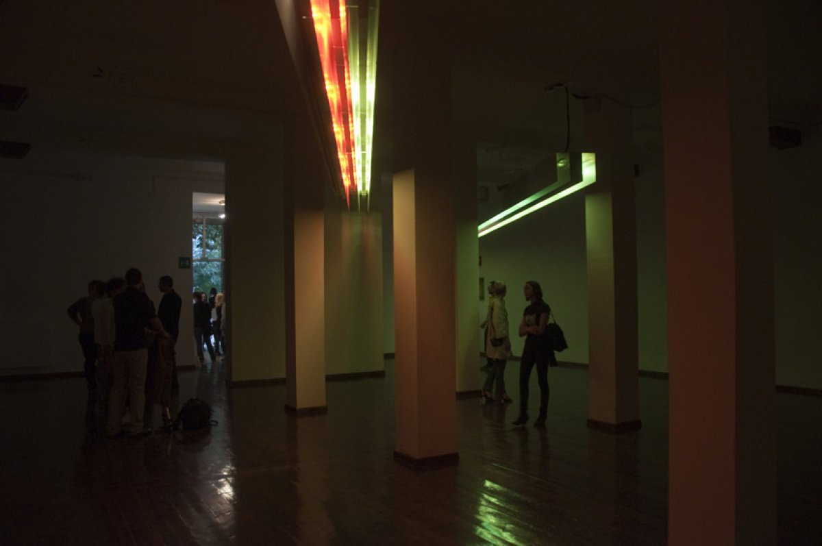 L’installazione di Simone Tosca, E, F, G e H, al piano terra del Pac, è un grande intervento ambientale in cui entrano in gioco la luce, il colore e l’astrazione. Lo spazio centrale sarà tagliato in obliquo da due assi di luce colorata pulsante, attorno a cui vibreranno opere disseminate fra l’ingresso e le due stanze sul fondo dell’edificio, a disegnare un unico ambiente cromatico in risonanza visiva. La personale di Simone Tosca è da immaginare come una sorta di mostra sulla pittura di paesaggio basata sui codici ancora carichi di idealismo dell’astrazione. Come dichiara l'artista: “Il tentativo è non tanto perseguire un ideale estetico, ma, al contrario, provare a demolire il significato delle cose attraverso strutture derivate dalle cose stesse. La mostra è dunque un esperimento a rappresentare il soggetto ed il suo contrario, la forma ed il suo contrario, il senso ed il suo contrario”. La performance musicale prende a sua volta le mosse dalla pittura di paesaggio – ad evidenziare ancor più l’idea di un unico mondo organico ritmato – e, calata nello splendido giardino del Pac, vedrà alternarsi registrazioni di suoni ed eventi meteorologici manipolati dal vivo affondati in strutture ritmiche e non-ritmiche.