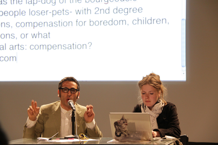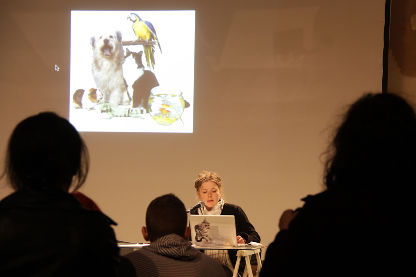 Autodomestication - Artists' Responsibility is a lecture and practical research about pets: cats, dogs, fish etc, different owners, institutions, contexts, homes, residencies, schools etc. It is also about the possibility of becoming a stray pet, and how in different countries run-away pets are dealt with. Another important issue is how increasingly more people are now learning from their pets: their ability to live in the present (aka charisma), their sensitivity for atmospheres and situations (the so called sixth sense), willingness to adapt, be flexible, the blurring of private and professional life.. etc. The qualities of pets are perhaps the survival strategies of the future. Needless to say that the pets themselves will need to adapt to this, too.