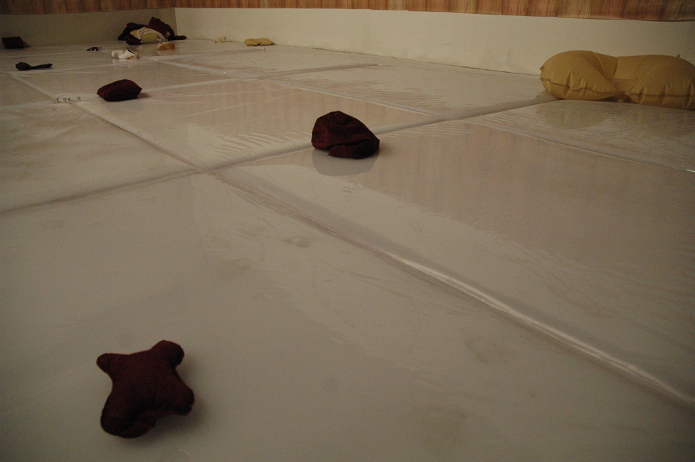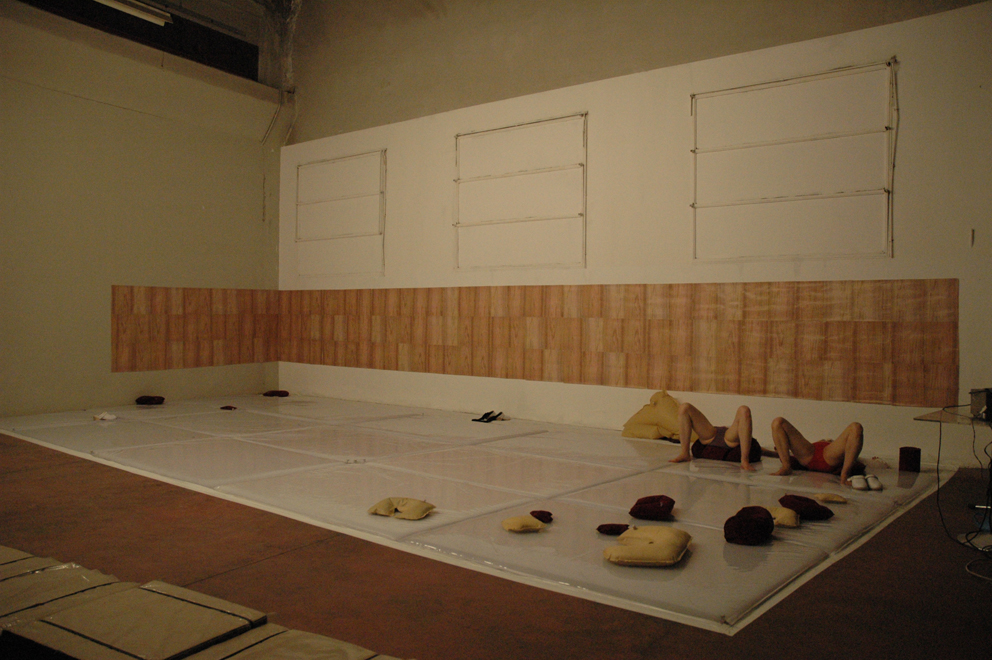 The performance $ Shot explores the relation between voyeurism and contemplation by creating a sophisticate physical vocabulary intertwined with the narratives codes of the pornographic genre. A work at once seducing and estranging which is also a reflection on the different forms of looking. Influenced by the formalist dimension of porn, but also by 60s and 70s minimalism, $ Shot explores a body freed from meaning and metaphor, and toys with fetishism and the representation and construction of the erotic body. All the elements flow together in an enigmatic and abstract event. The actions of Jennifer Lacey and Erin Cornell unfold within the dense and luxurious visual space created by Nadia Lauro: an unstable surface covered by a milky liquid over which spread like a perfume the live sounds of Andrea Parkins, issued from soundwave generators and filters made of leather, wood and other organic materials.
