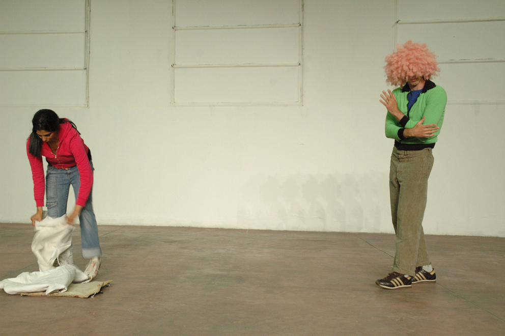 Touze’s choreography Morceau enabled the four performers to display with audacious non-chalance a series of acts almost as numbers. James Brown, a chronometer, Dalida, a polar bear, Jacques Chirac and John Malkovich, a poem, a samurai, some silences… an enjoyable profusion of signs, images, words and fictions in a changeable scenario which questions acting codes and the implicit makeup of the scene.