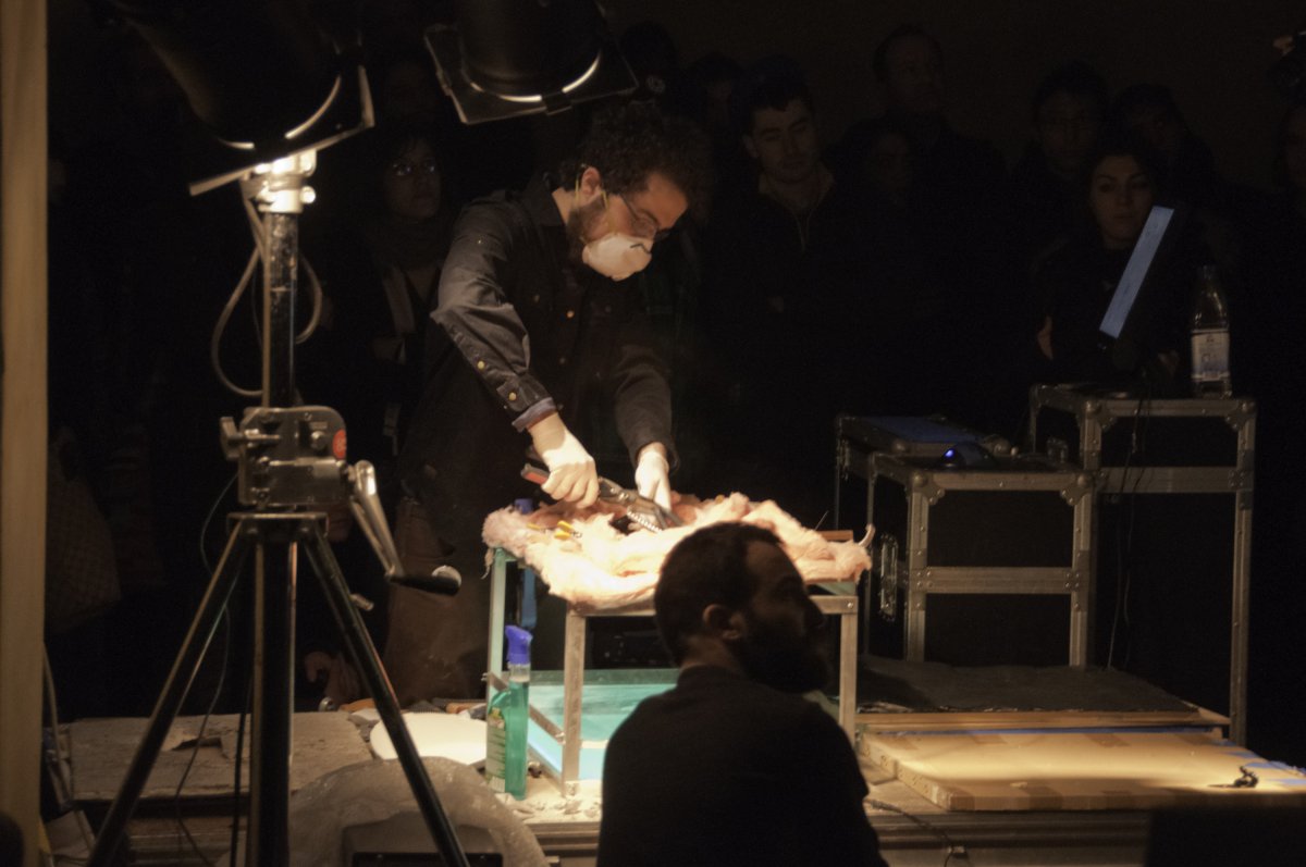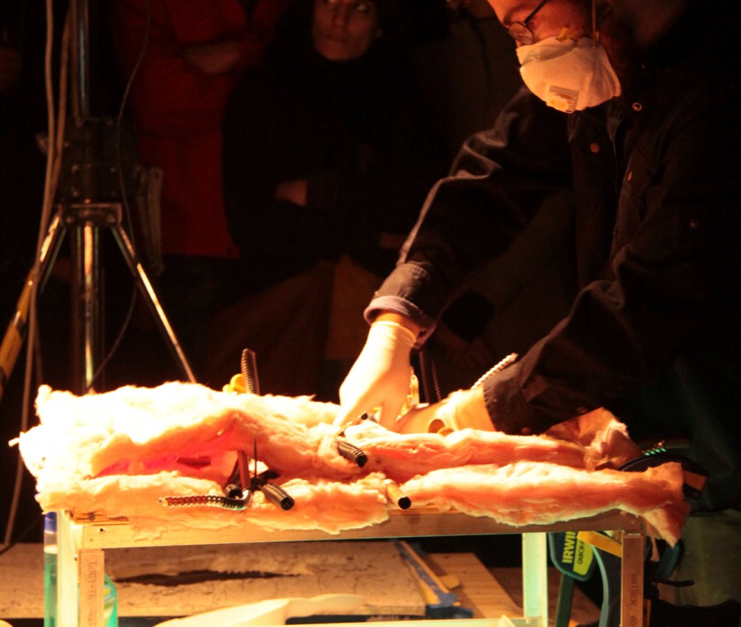 The visual narrative of Tunneling, the project presented at Netmage, is defined through the process of cutting through the wall of the performance space from inside to outside, the different layers within the building wall slowly exposed until the outer, nighttime street is reached. This image is constructed in real-time by cutting miniature boards made of the different materials in the wall, combined through use of a specially constructed green-screen lightbox and custom software which 'memorizes' the appearance of each layer of material as it’s being cut. The audio narrative consists of a multitude of voices singing verses, which are at first multiplied by many thousands, and slowly decimate while the wall is exposed until only one, the real voice of the audio performer, is left when the street outside is finally reached. An additional layer of domestic cooking sounds is intertwined with the voices, juxtaposed with the sounds generated by the cutting of the wall-layers.
