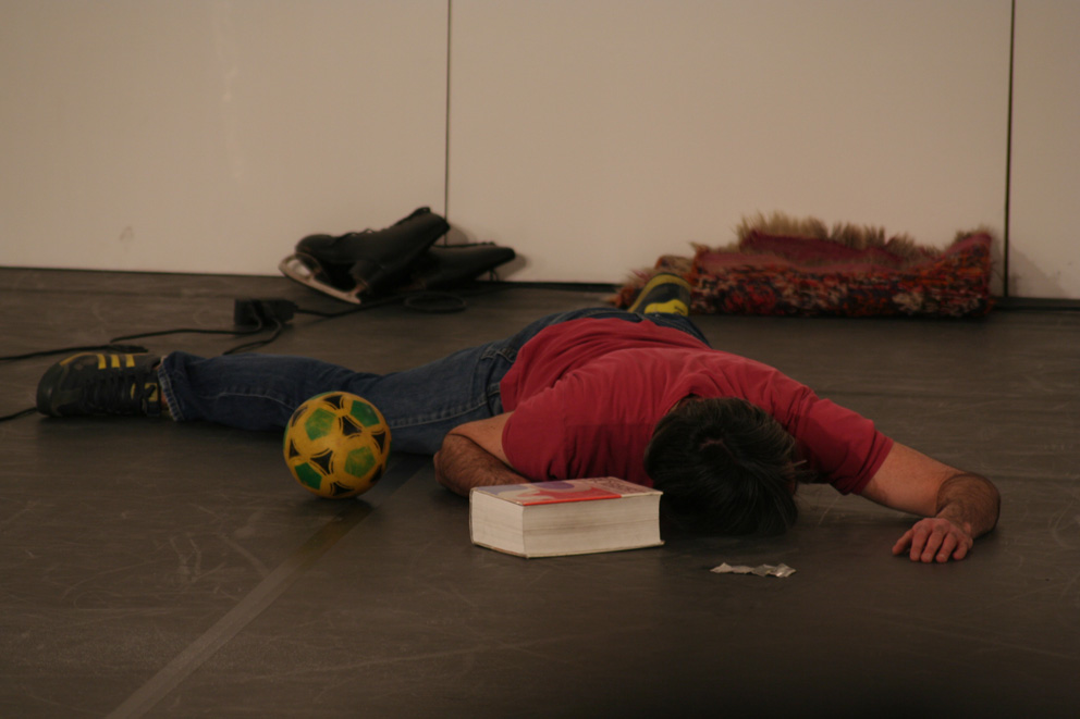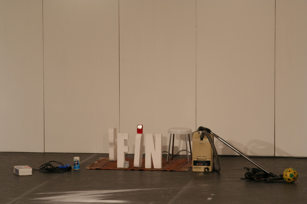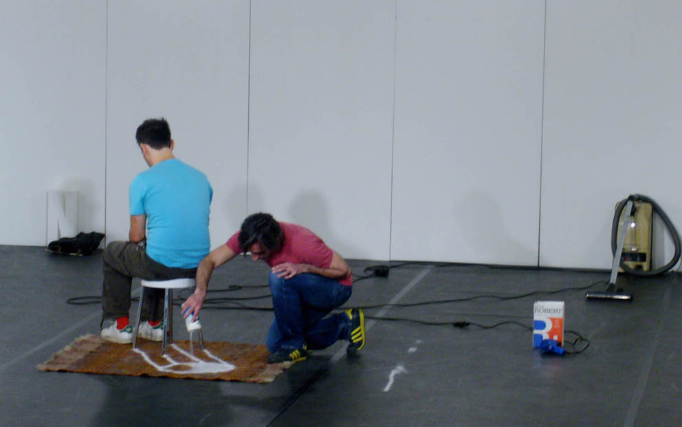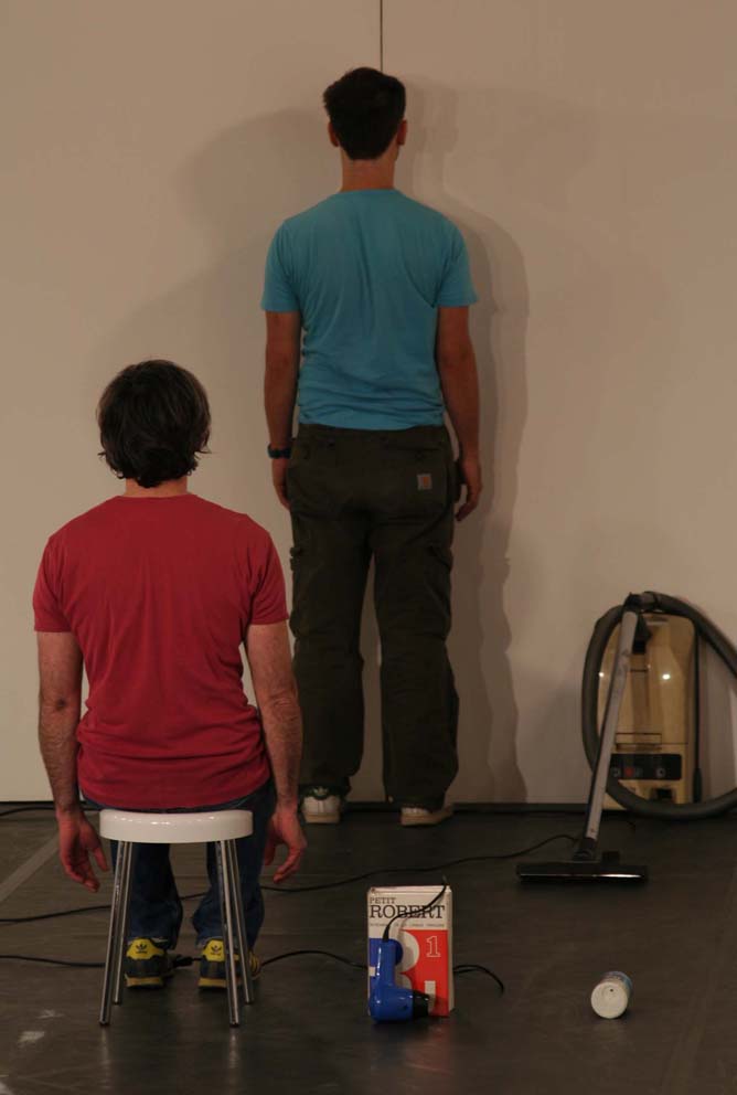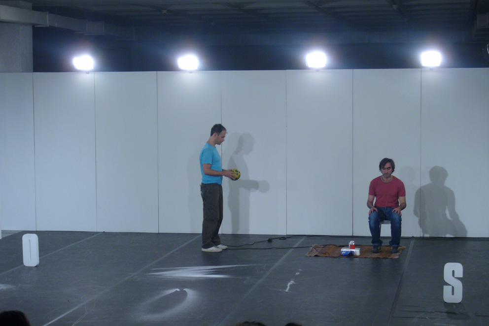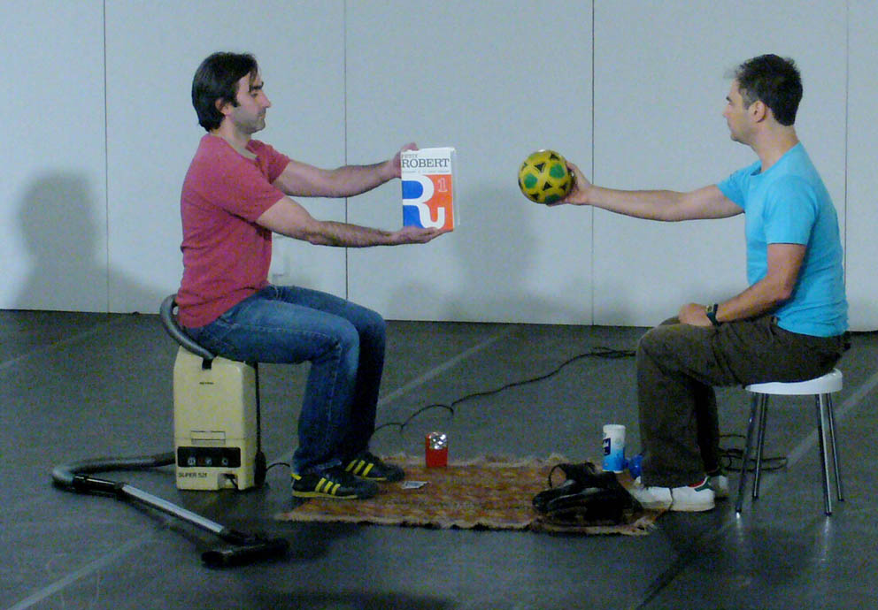 Nom donne’ par l’auteur (name given by the author), in other words, the definition of the word ‘title’ according to the French dictionary, is Jerome Bel’s first choreographic creation, a seminal work for European dance which dates back to 1994. It could be a choreography of objects, a theatre of things, a multi-perspective painting, a classical ballet with accompanists or a performance: according to the way in which one looks at this essential pair, Jerome Bel and Frederic Seguette, lead this concatenation of signs and actions, following a precise visual and spatial score. Ten objects constitute the material for the piece: they are placed in the space and start to react. A good take on the potential of the Saussurian sign: signifier/signified. The connections ignite sparks in an unexpected way, mixing up different orders of reality. In this work on material culture, not only are the intellectual borrowings from Roland Barthes’ The zero degree of writing and George Perec’s Things very clear, but so is Bel's intention to stay within the dance sphere in order to explore the linguistic possibilities of the choreography. This rediscovery of Bel for F.I.S.Co.08, wants to open and close an avant-garde experience, not to be relegated to documents, proposing it once again as a living story.