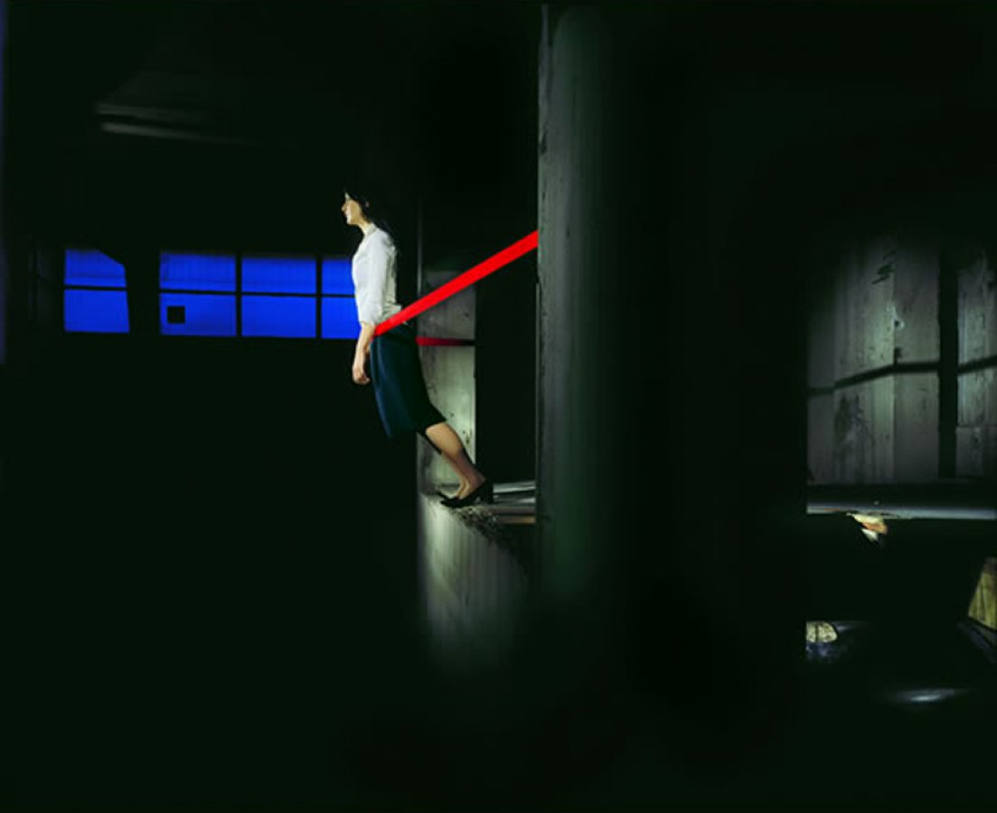 La performance di Marcello Maloberti All’incirca alla vita, nata per gli spazi della Galleria Raffaella Cortese prima del restauro, viene ripresa all’interno del battello del Batofar. Una ragazza si sporge da una posizione elevata ed è sorretta da una fascia rossa di nylon. Il suo sguardo è assorto, rivolto al nulla, la postura e la tensione della fascia esprimono un’immobilità precaria.