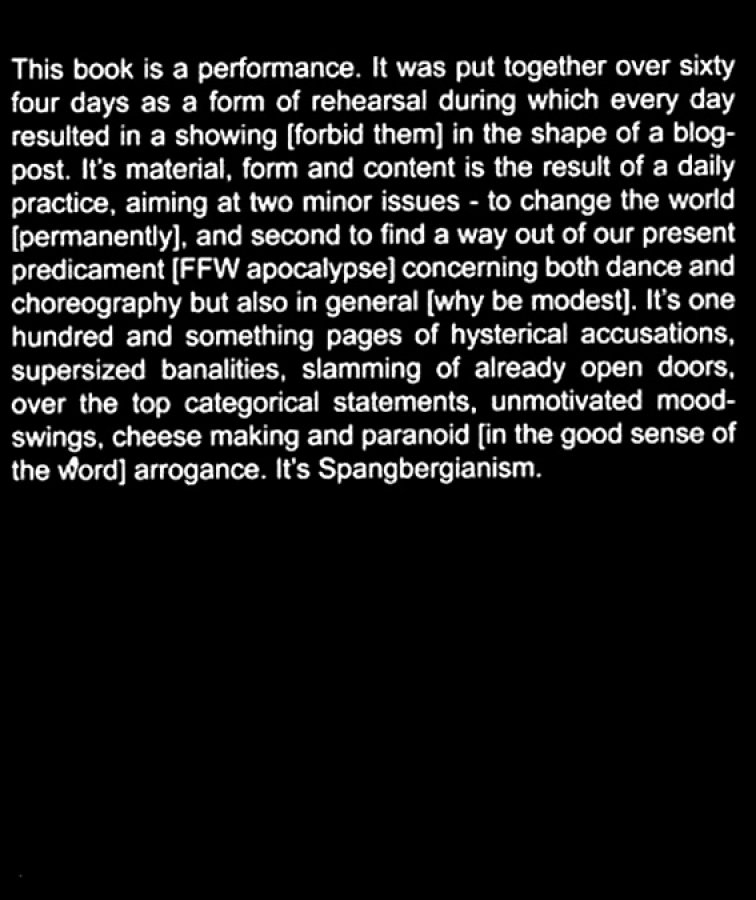 Spangbergianism The Book non è un testo che va dalla A alla Z, non c'è una narrazione lineare che segua una logica interna, sono un centinaio di pagine di accuse isteriche, banalità amplificate, porte che sbattono e porte già aperte, con asserzioni categoriche e altalene umorali immotivate, coagulazioni e arroganza paranoica (nel senso buono del termine). E' un attacco, o meglio un esorcismo, dall'interno di pratiche artistiche e associate cha partono dalla danza e la performance.