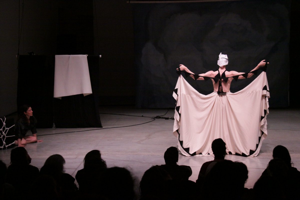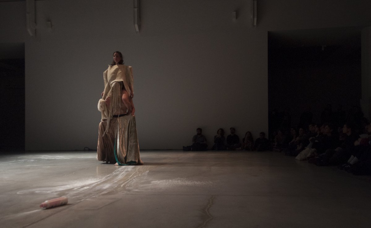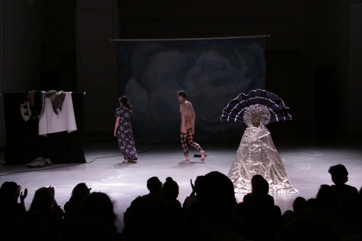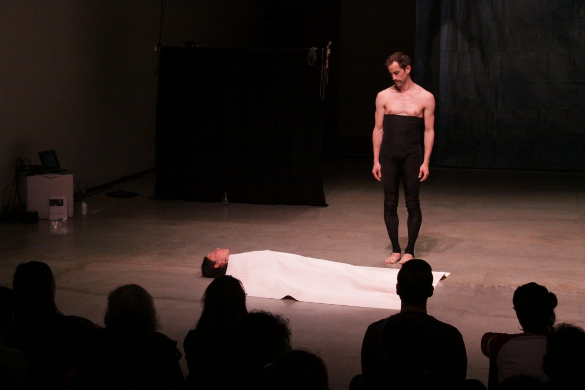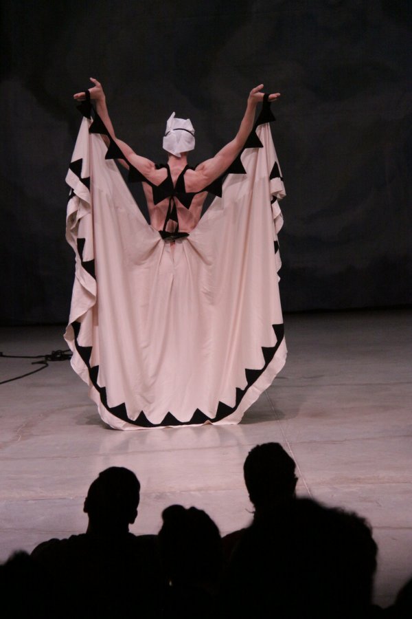 In Monique Alix Eynaudi and Mark Lorimer merge, subverting values, various techniques and imagery related to the body: gymnastics, contemporary and modern dance sexual games, and movement therapy. "SM meets action art meets contact improvisation meets les ballets russes". Monique puts together and takes apart rituals involving bodies, objects and costumes, opening up many possibilities of transition and passage from one point to another. The aesthetics of Monique do not stop at the cliché, but go on to discover the potential of the other side. In a historic suspension, lights, décor and music trample with impunity the ideas of good taste, in the quest for a liberation of theatre. In Monique it is clear that things on stage have a body, and between these bodies, as well as in the air, there is a constant electricity: there is something animistic.