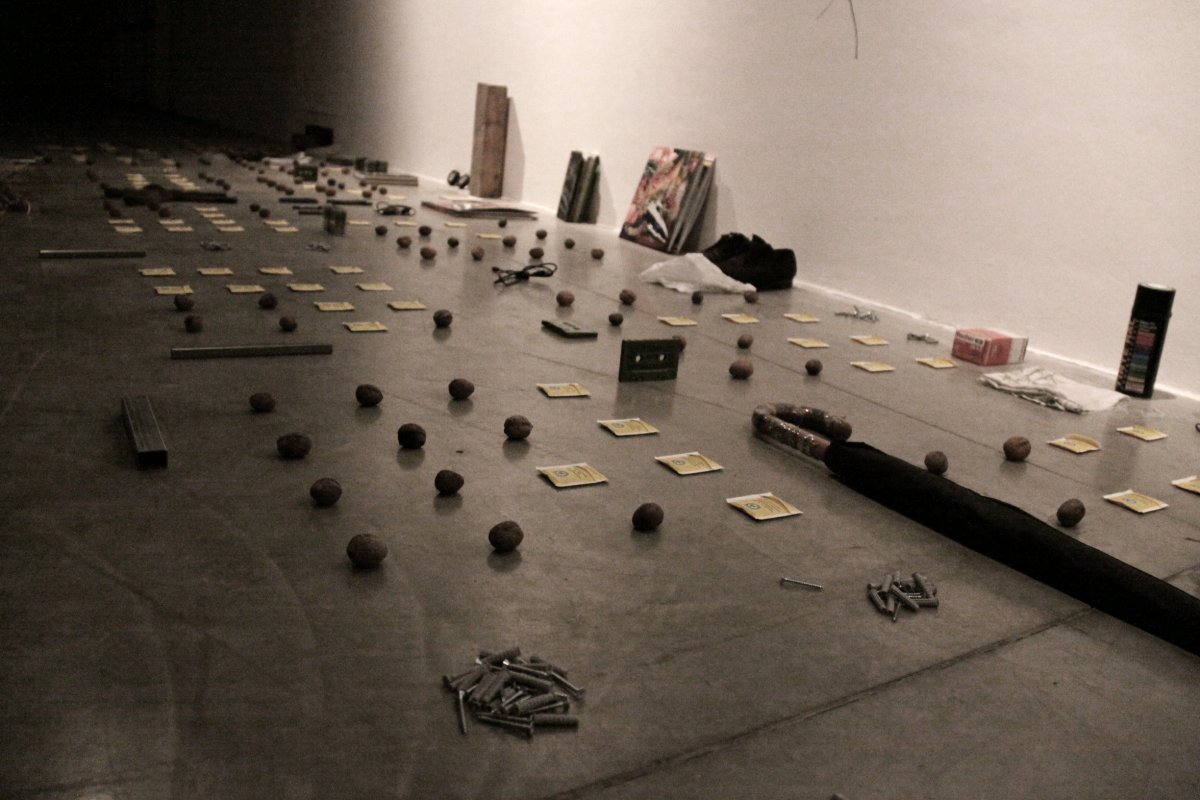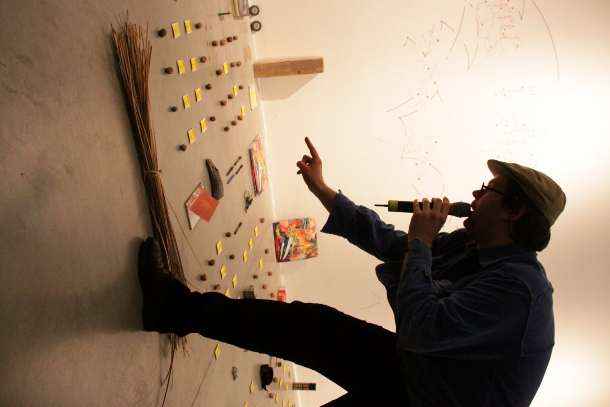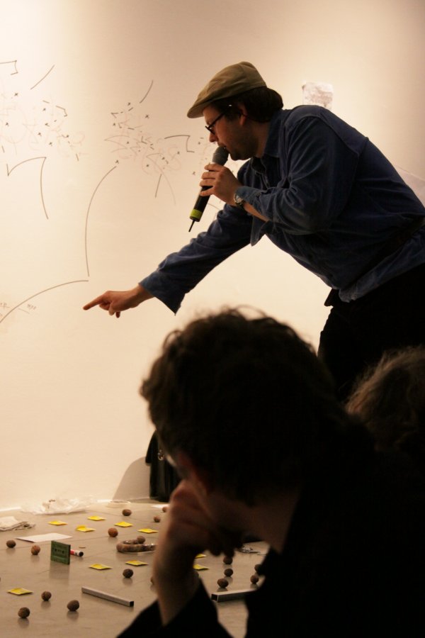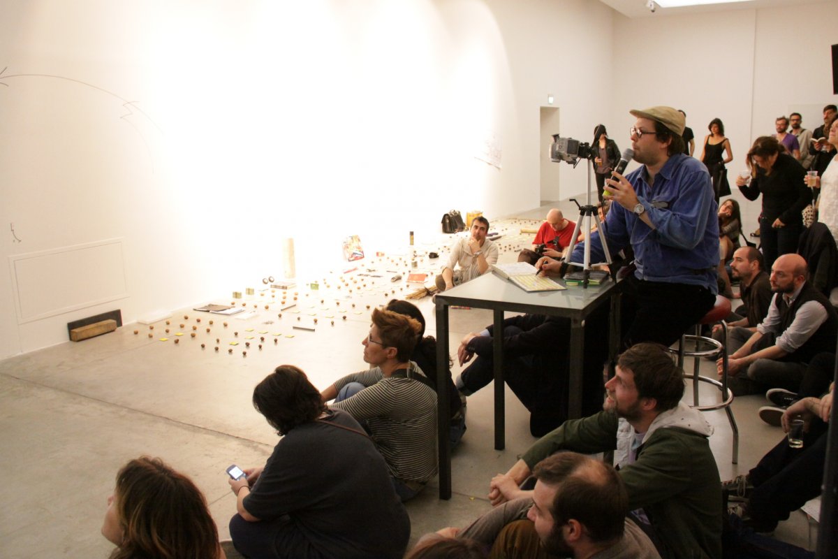 [ ] is a lecture performance in which - as a rule - following a pre-recorded track, Goodiepal develops a discourse on the history of contemporary computer music. Following an almost obsessive rhythm, determined and convincing, Goodiepal places objects on the ground, builds connections, mixes personal history with the history of contemporary music, assumes radical positions without giving way to stereotypes. His criticism of what he calls 'cultural postures' (the endless repetition of personality types and traits) of art and culture, becomes intense and flagrant in his gags or imitations.