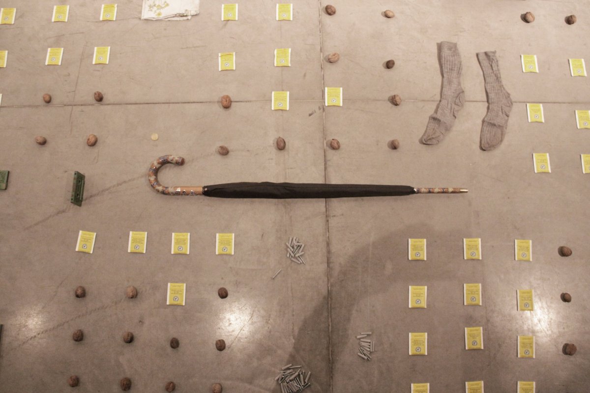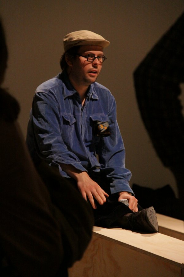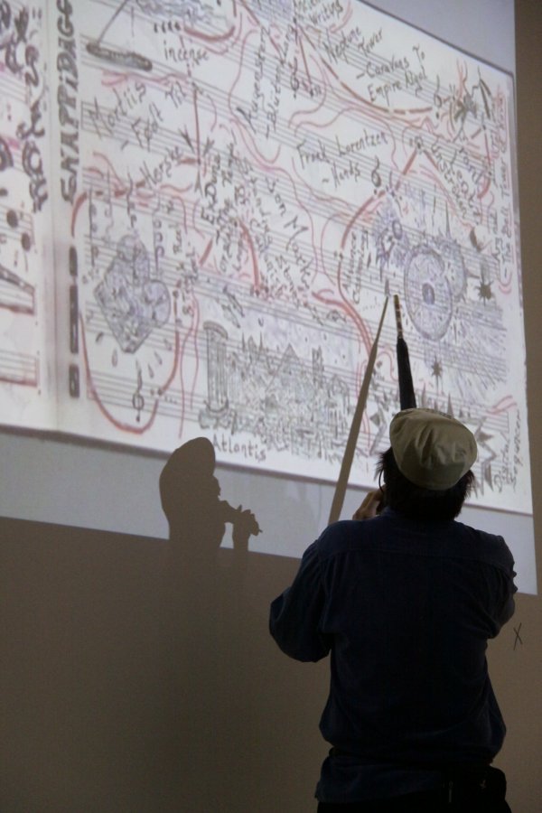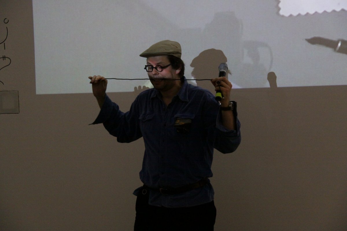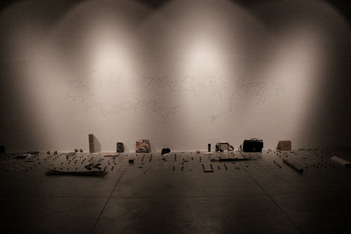 [ ] is a lecture performance in which - as a rule - following a pre-recorded track, Goodiepal develops a discourse on the history of contemporary computer music. Following an almost obsessive rhythm, determined and convincing, Goodiepal places objects on the ground, builds connections, mixes personal history with the history of contemporary music, assumes radical positions without giving way to stereotypes. His criticism of what he calls 'cultural postures' (the endless repetition of personality types and traits) of art and culture, becomes intense and flagrant in his gags or imitations.