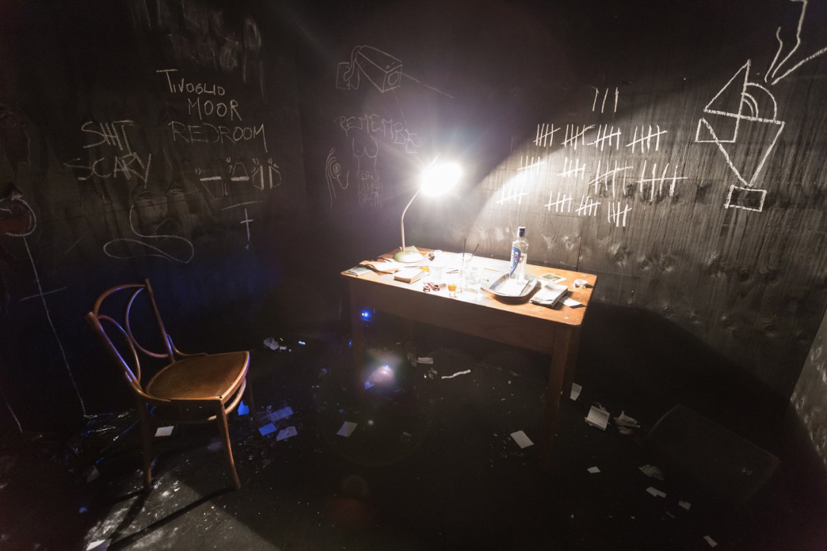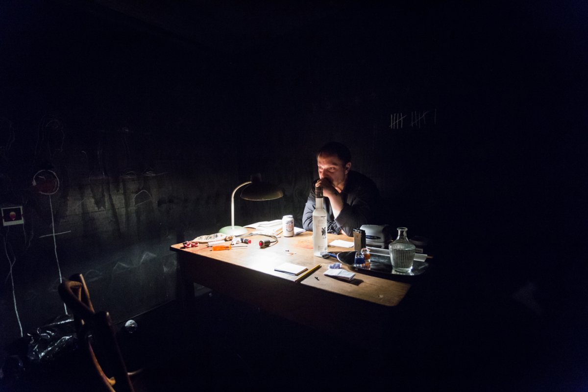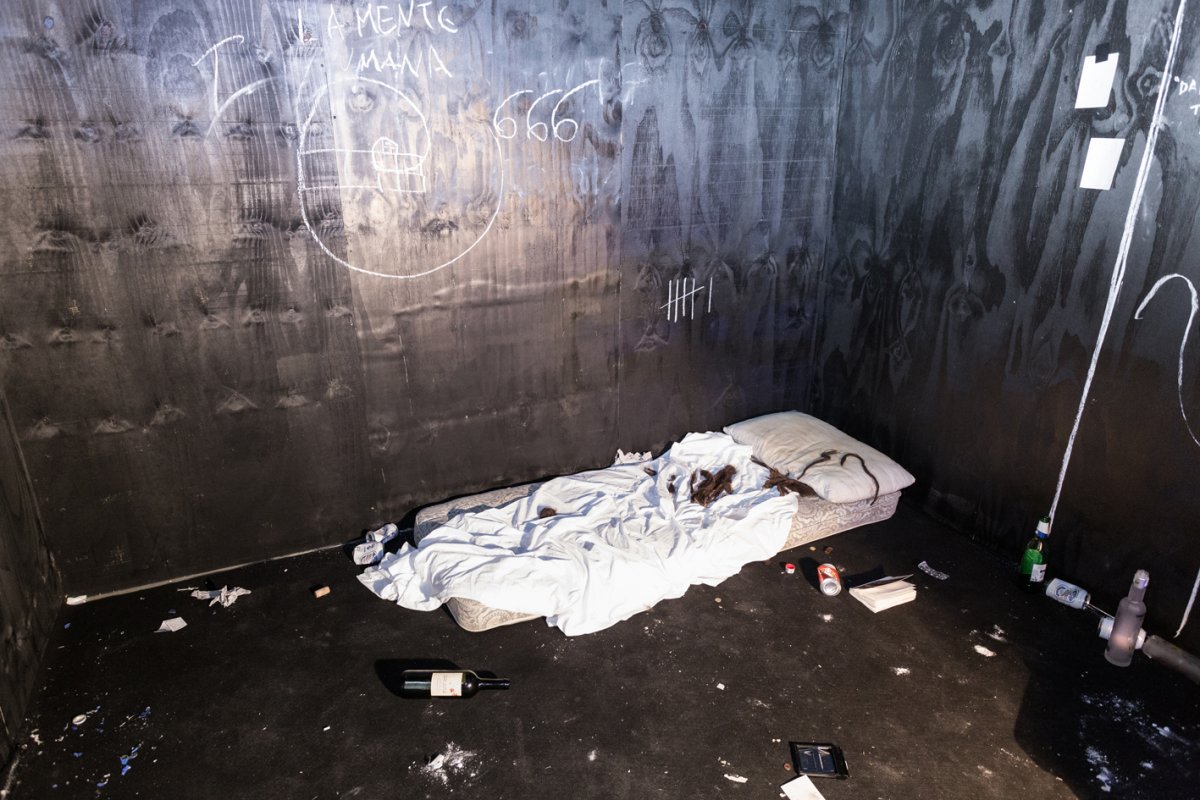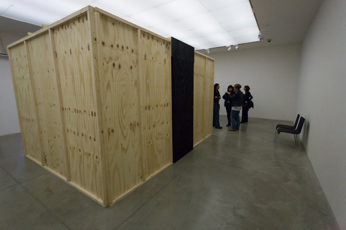 Waiting Room is a performative installation and a setting/environment to spend time witout ANY reference: the human situation of being exposed to the other. A black room inside a white room. An existentialist box that can host only two people facing each other. Distinct noises, introspective silence, body sounds, vodka, nothing, duration, weakness and embarrassment. Materialistic transcen-dance.