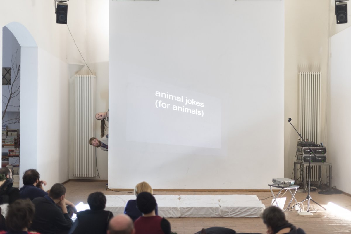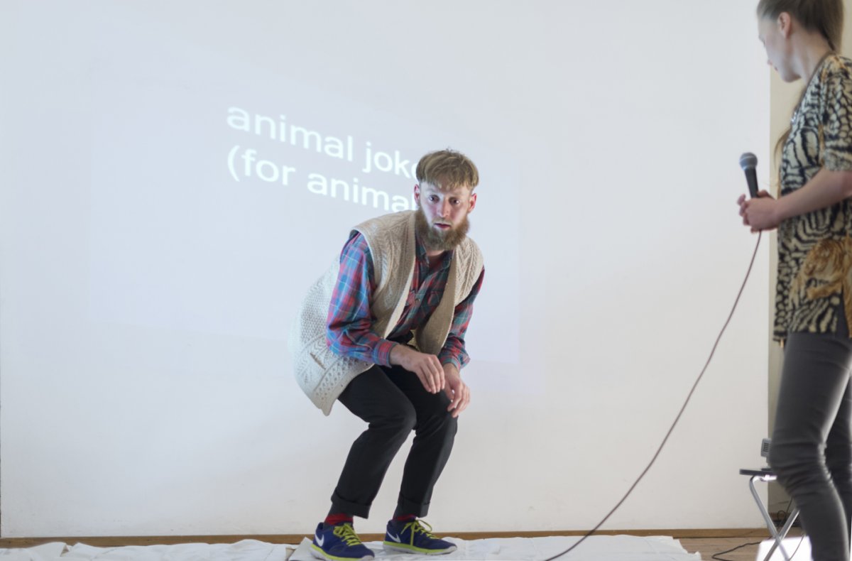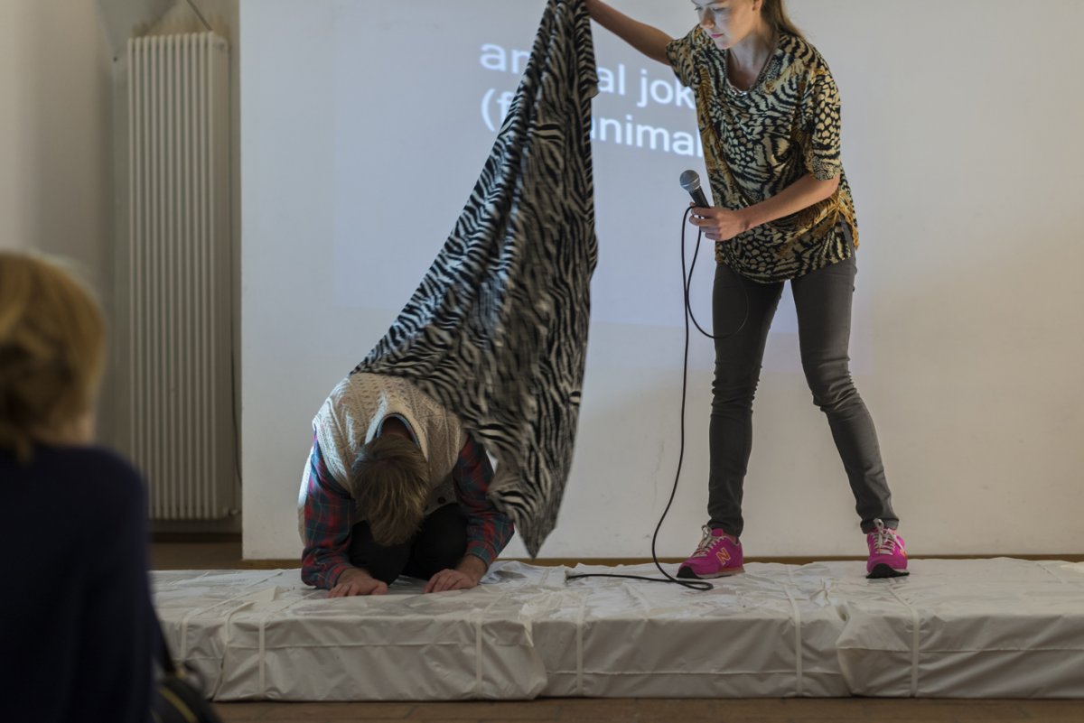 Krõõt Juurak and Alex Bailey demonstrate the results of their research project on the subject of animal humor, focusing in particular on the humor of house pets. Anthropologist Lévi-Strauss stated famously in his Totemism (1962) that "animals are good to think with”. Maybe they are also good to laugh with. Animal Jokes (For Animals) can be viewed by human and non-human audiences alike, although laughter cannot be guaranteed for humans. This performance stems from the long-term research project Autodomestication (presented in Bologna at F.I.S.Co.10) about immaterial labour across species and is an abbreviated version of the project Animal Show, which will premiere in Vienna at WUK in 2015.