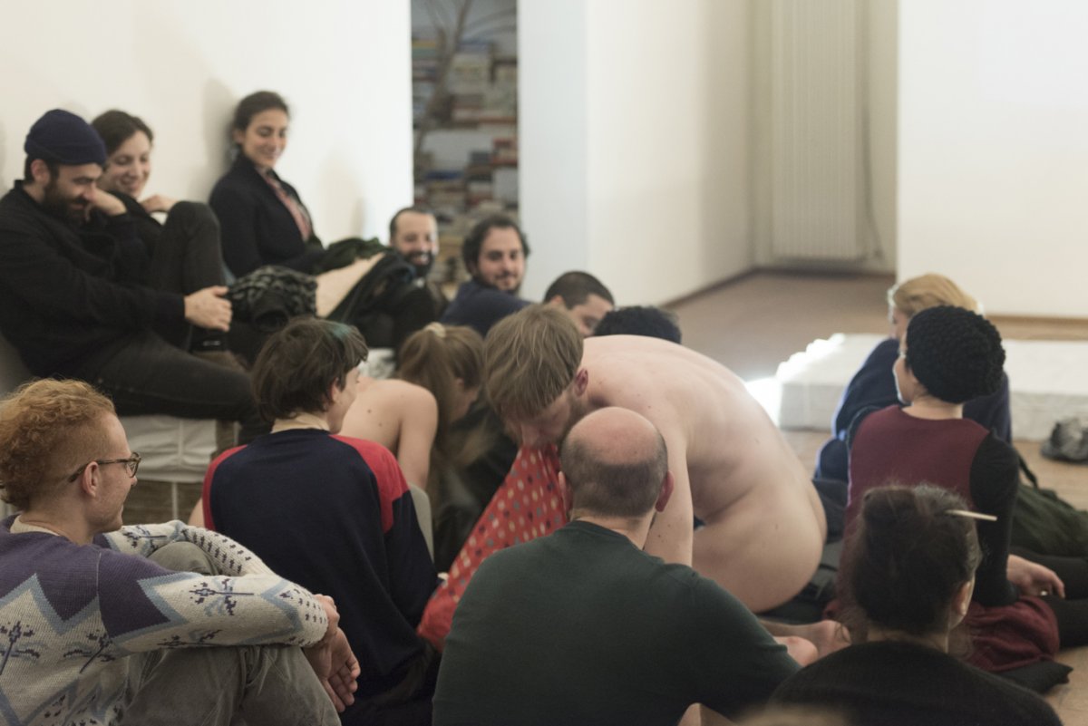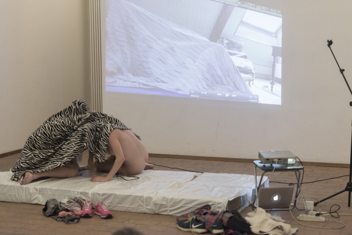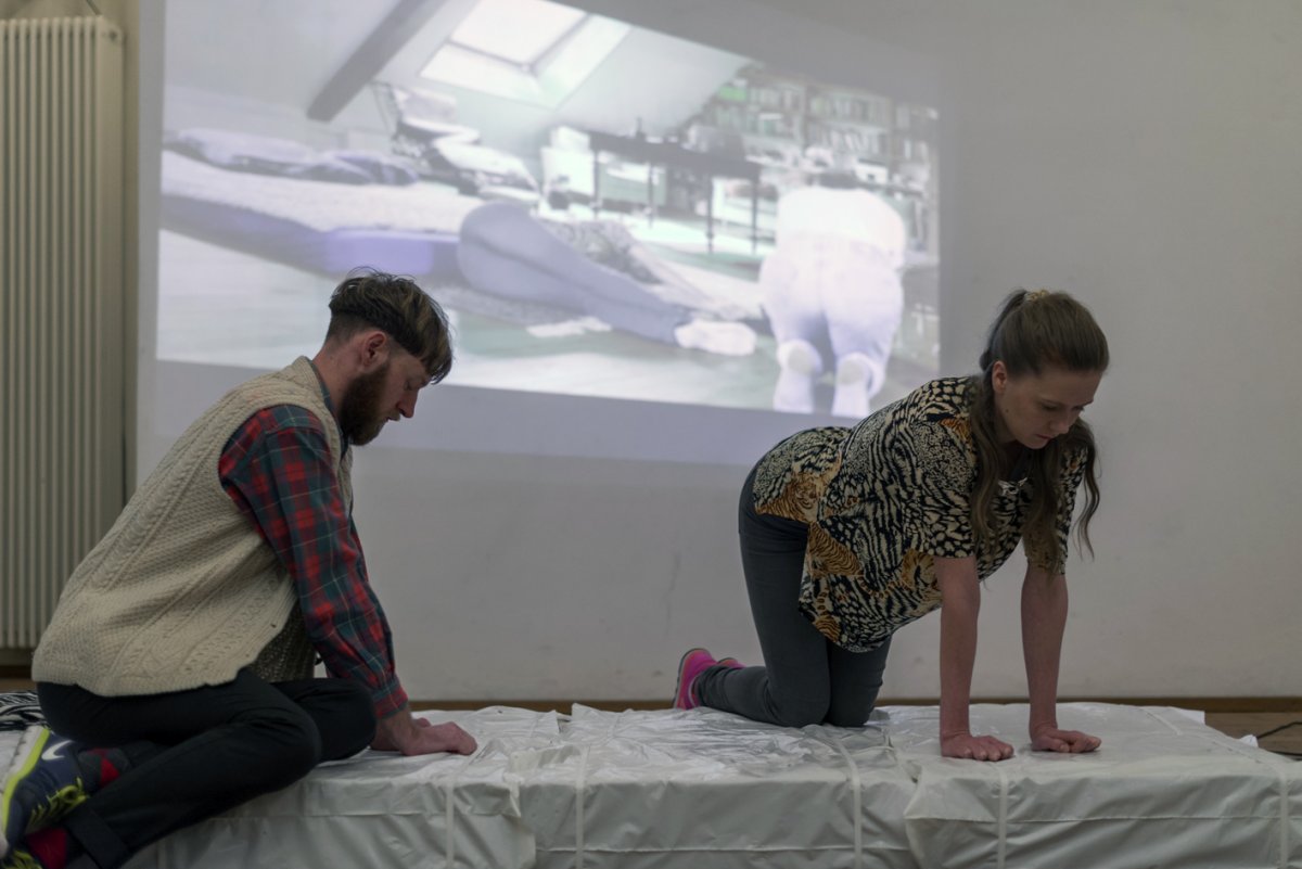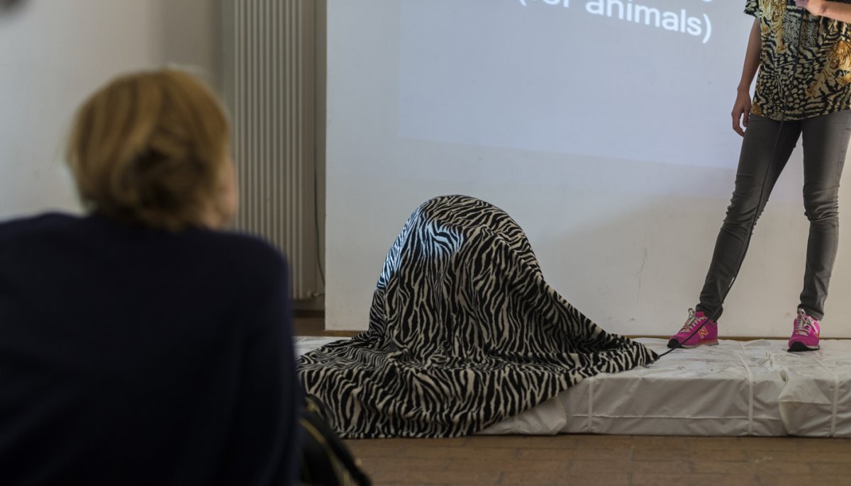 Krõõt Juurak and Alex Bailey demonstrate the results of their research project on the subject of animal humor, focusing in particular on the humor of house pets. Anthropologist Lévi-Strauss stated famously in his Totemism (1962) that "animals are good to think with”. Maybe they are also good to laugh with. Animal Jokes (For Animals) can be viewed by human and non-human audiences alike, although laughter cannot be guaranteed for humans. This performance stems from the long-term research project Autodomestication (presented in Bologna at F.I.S.Co.10) about immaterial labour across species and is an abbreviated version of the project Animal Show, which will premiere in Vienna at WUK in 2015.