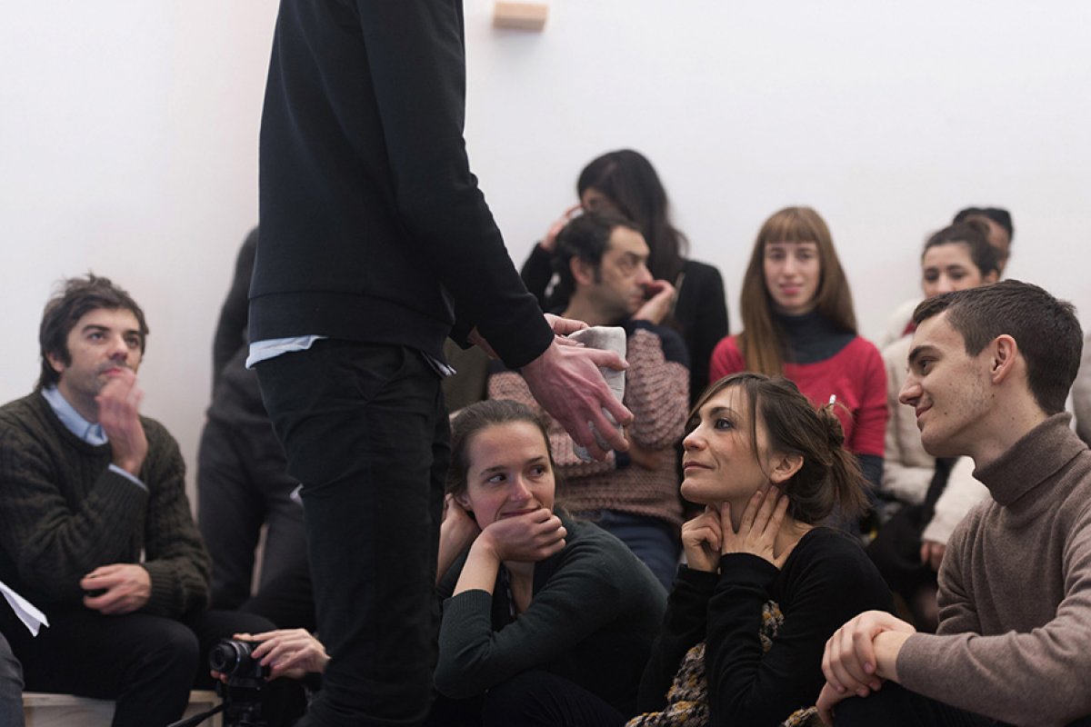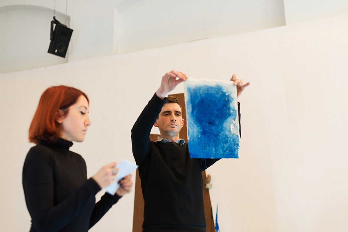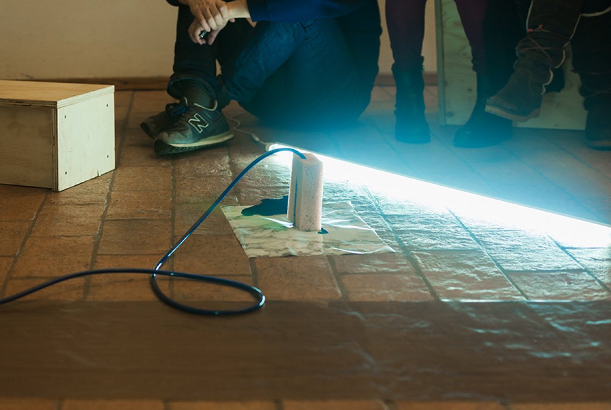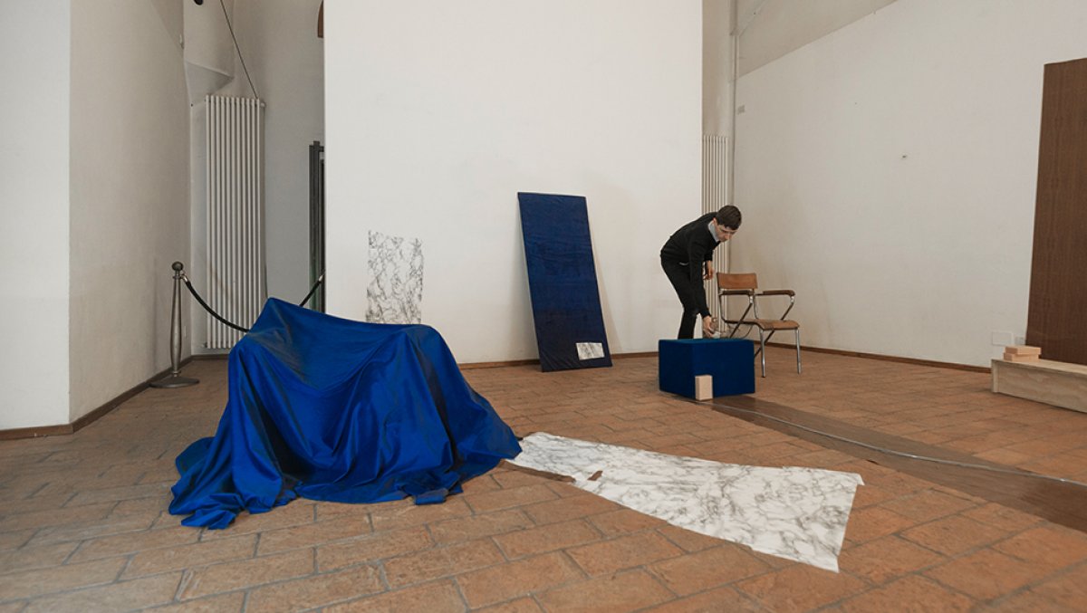 "Walking through Rome we did not find the Trevi Fountain but some scaffolding with an image of the same, and a small tub of water. The gap between the size of the original fountain and the modesty of its stunt double was funny and had in it a force. A force that we joyfully called The Surrogate. We think of situations, forms, processes, images that replace something inaccessible, invisible or absent. Phenomena that result in surfaces, interfaces, emanations, representations offered to the world. For example an empty niche in a church. For example, a potato that gives water to its shoot and almost disappears, it becomes very small, now it's going to die. The Surrogate has to do with matter, its needs, with time but also with the human thought. This first study activates experiments, it collects some of the results and presents them to an audience. The public presentation at Raum will venture a guess with a certain demonstrative attitude."