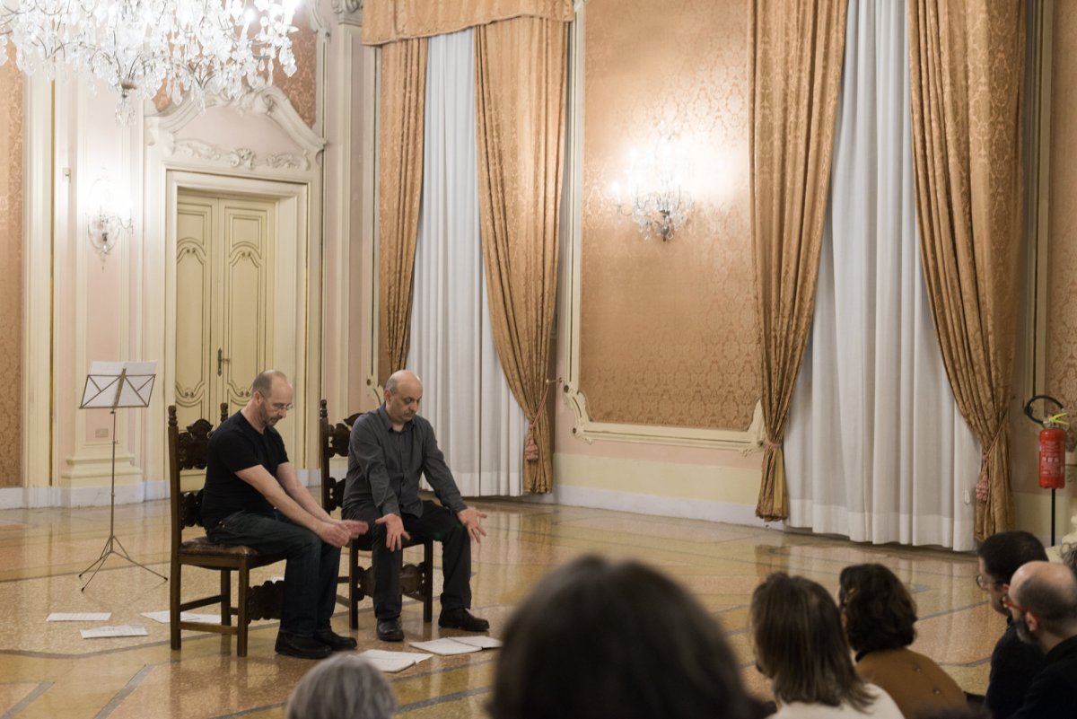 Both Sitting Duet was Burrows and Fargion's first duo, which takes as its starting point a literal translation of the score of Morton Feldman's violin and piano piece For John Cage, creating a gestural counterpoint of silent music.