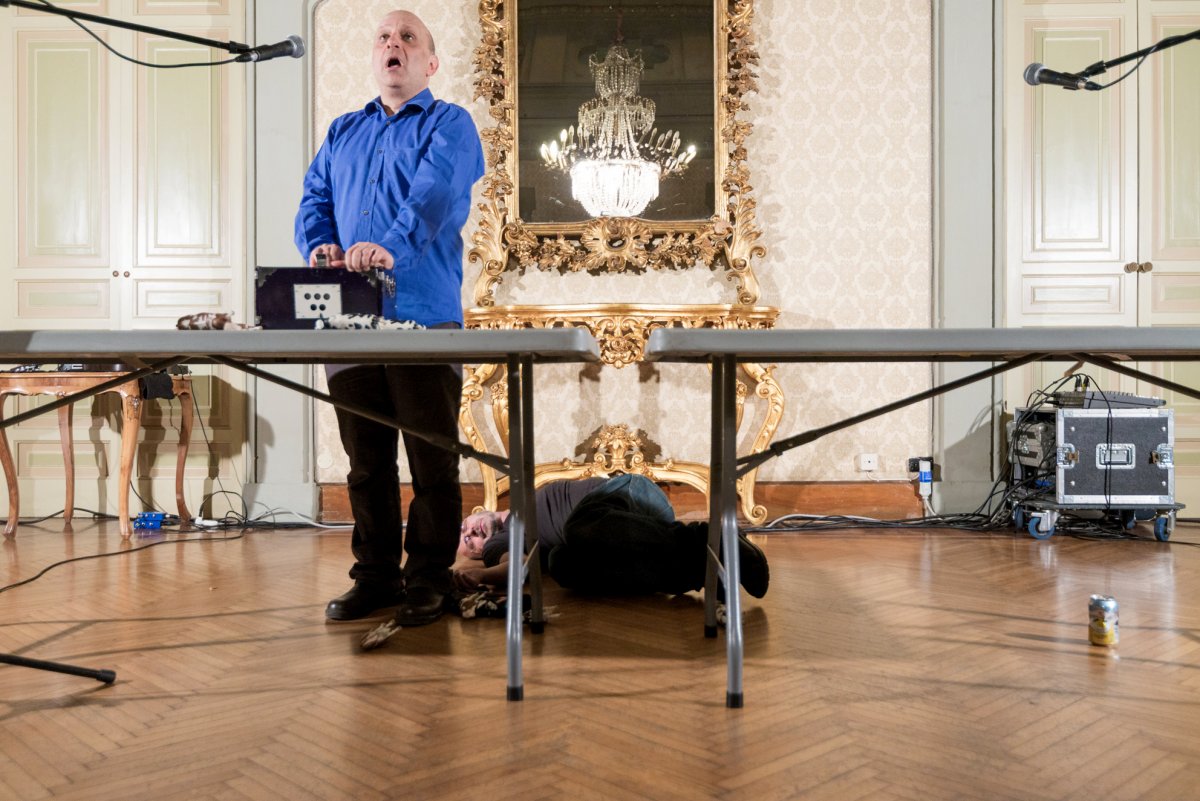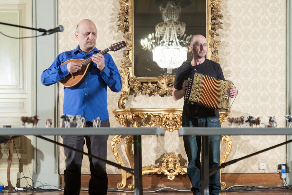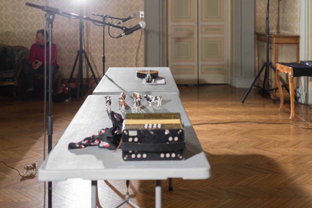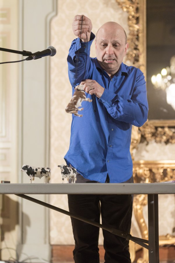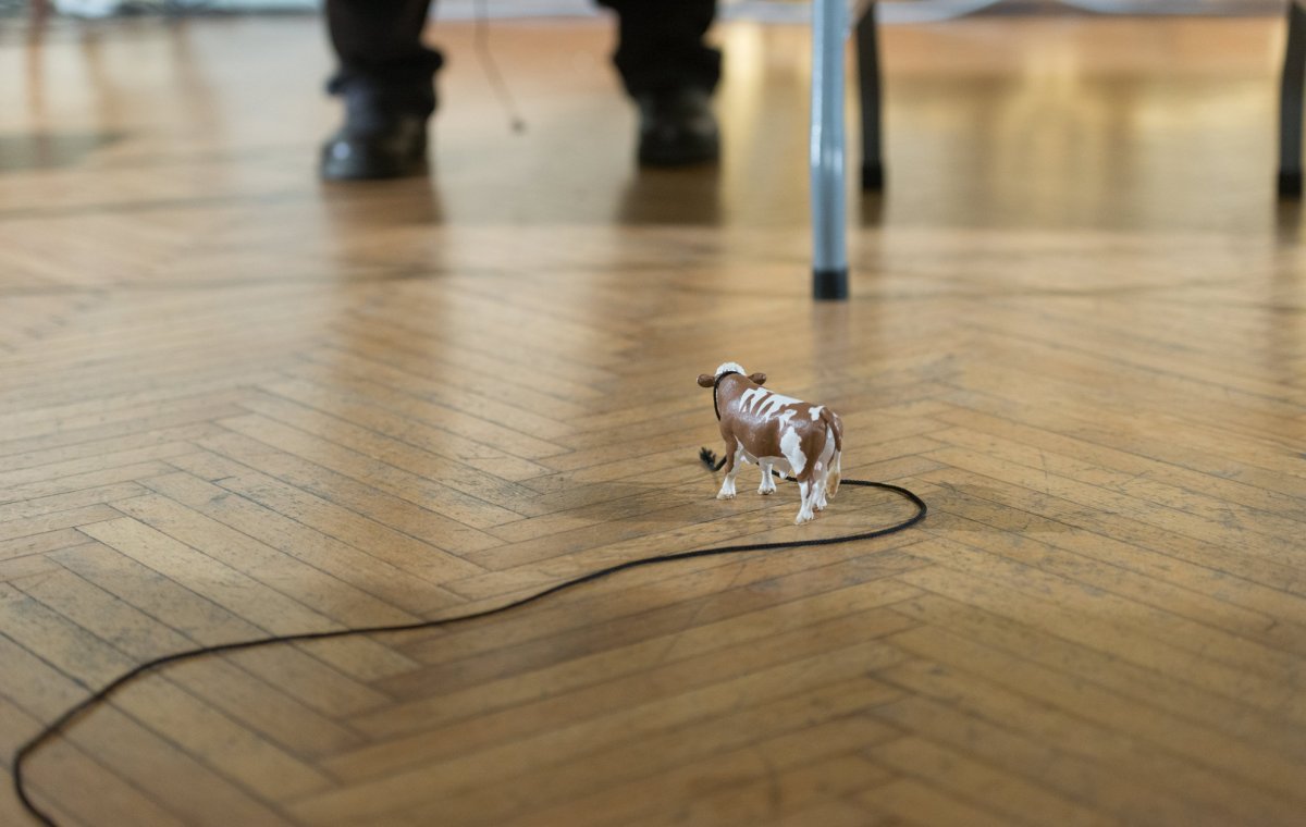 Burrows' and Fargion's The Cow Piece is a riotous celebration of the limits of logic, where two tables become the staging ground for 12 plastic cows who dance, sing, speak, think, sleep, go, come and die in a series of ritual executions. The piece is one of a series of performances in which Burrows and Fargion translated and questioned the structure of John Cage's 'Lecture On Nothing'.