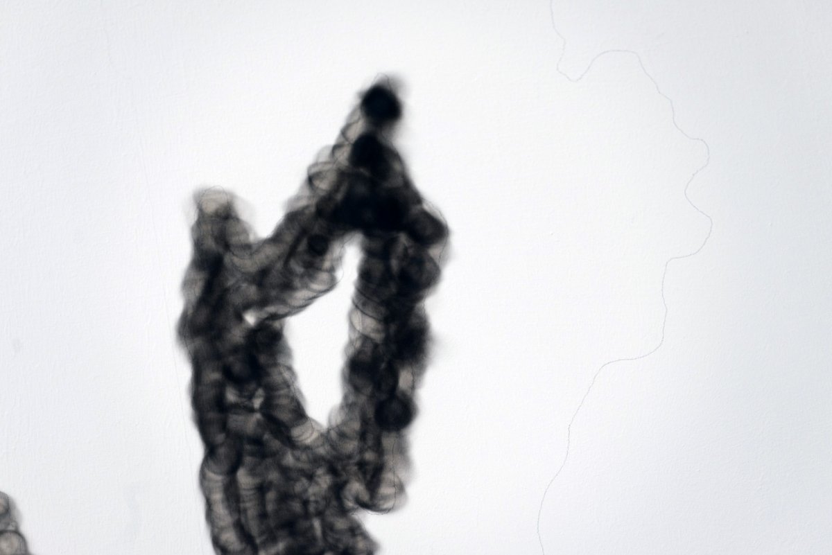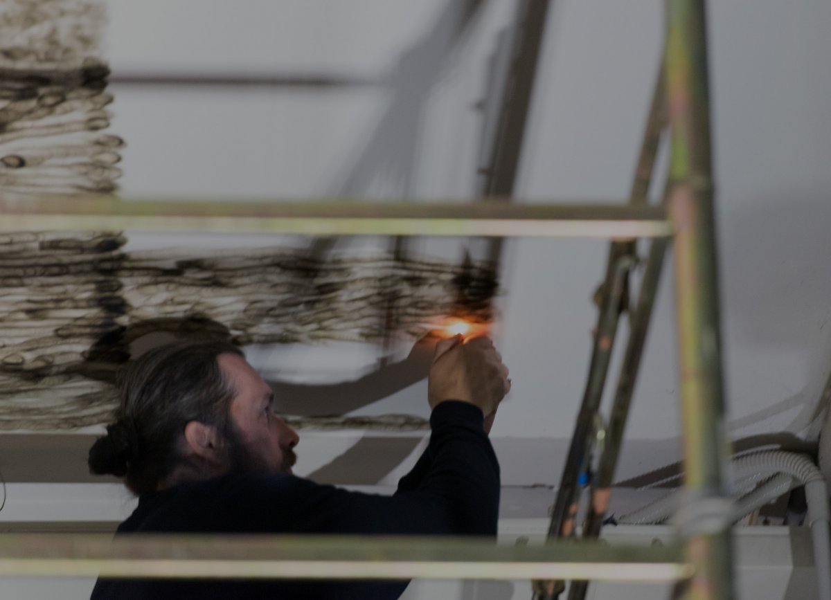 With Squatter, regarder le ciel Olivier Kosta-Thèfaine installs himself at Ex GAM for some days. Here he carries out his activity, half-hidden on top of some scaffolding, visible only within a shred of time that could be of infinite length. The surface-area that he must contend with is enormous. With a technique that has been expertly honed over the course of years, Kosta-Thèfaine uses the chromatic effects produced by the flames of a cigarette lighter to compose pointillist figures on the ceiling. If we are deprived of this preliminary information, these markings might remind us of a byzantine or Moorish decorative tradition, perhaps imported by new migrants to the banlieue; but this isn’t what the piece is about. The vastness of space to be filled – an entire sky – corresponds to the expansive length of time of an unnecessary labour. Bored inhabitants squat vast peripheral buildings, concrete corridors and stairwells. These are the places of a possible encounter between vandalism and poetry.