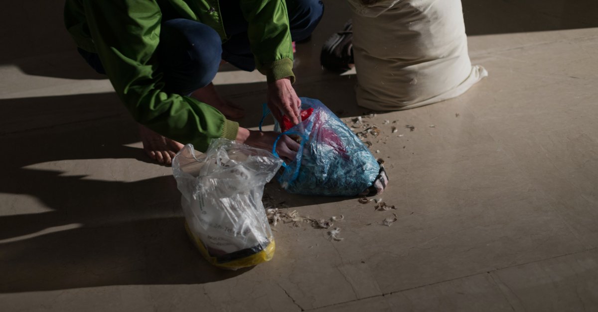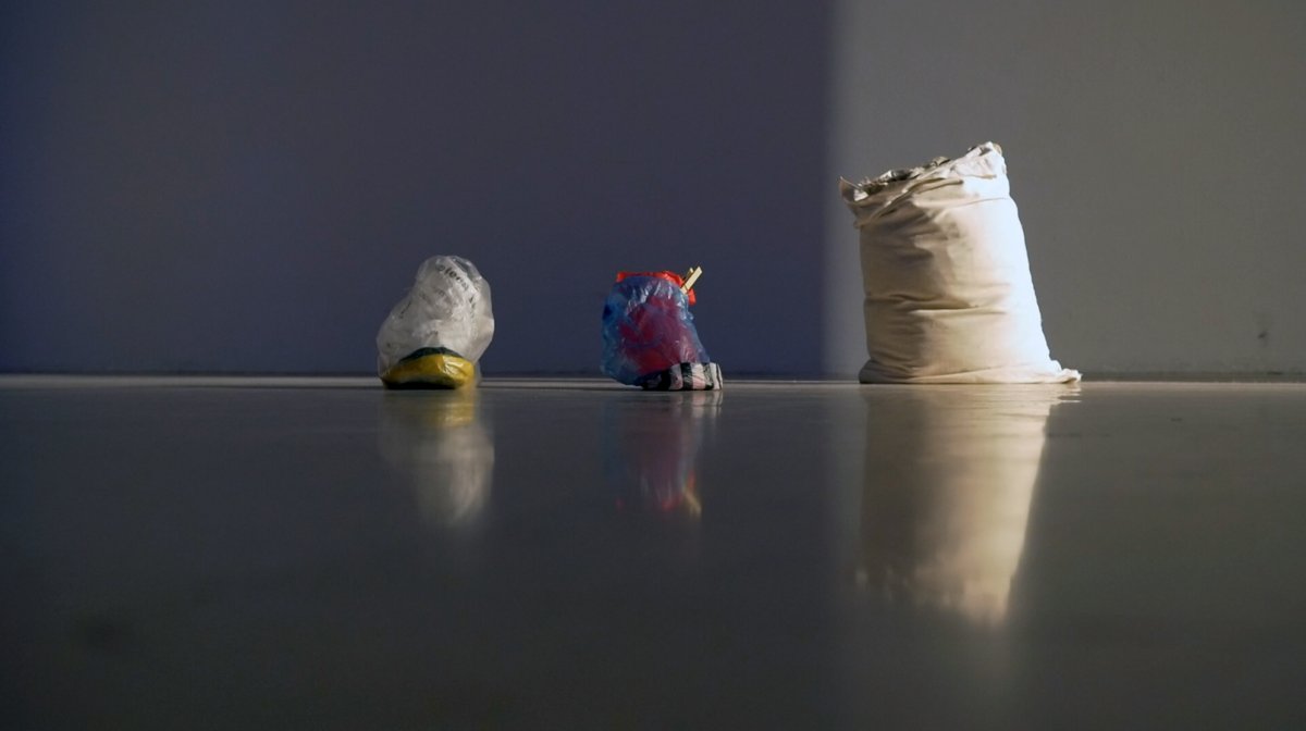Ghosting Rachmaninov - At My Window (A Bird Cherry Tree), Anne Naysmith, Diogenes (no need for a lantern at night) pays tribute to Anne Naysmith who early on in her career as a concert pianist and educator became homeless and spent the remainder of her life living independently and resourcefully amongst the streets of London. As an homage to this independent figure Ashes Withyman Moore fabricated a pair of slippers out of carrier bags and pigeon feathers and wore them across Bologna in the night.