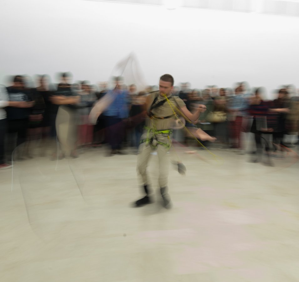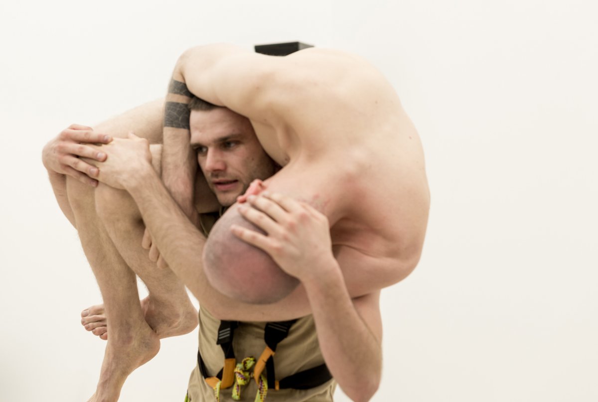 In HighWay a lost figure is exposed in an empty art gallery searching for grip. The work deals with the impact of outer forces on the body and the capability of this body to translate them into autonomous material. The ropes that connect the figure to the surrounding architecture provide both support and restriction. The body, becoming and colliding with the space, is shifting between states of power and surrender, effort and rest, volume and flatness. By referencing traditional artistic craftsmanship the practice of imitation is addressed, not only as an execution of tasks but also as a process of constructing subjectivity. In this transforming communal space, questions about art and live medium are raised. While architecture, interior and frames are pulled out of their comfort zone, body-parts and sounds occasionally multiply among the audience and emancipate into the shifting space.