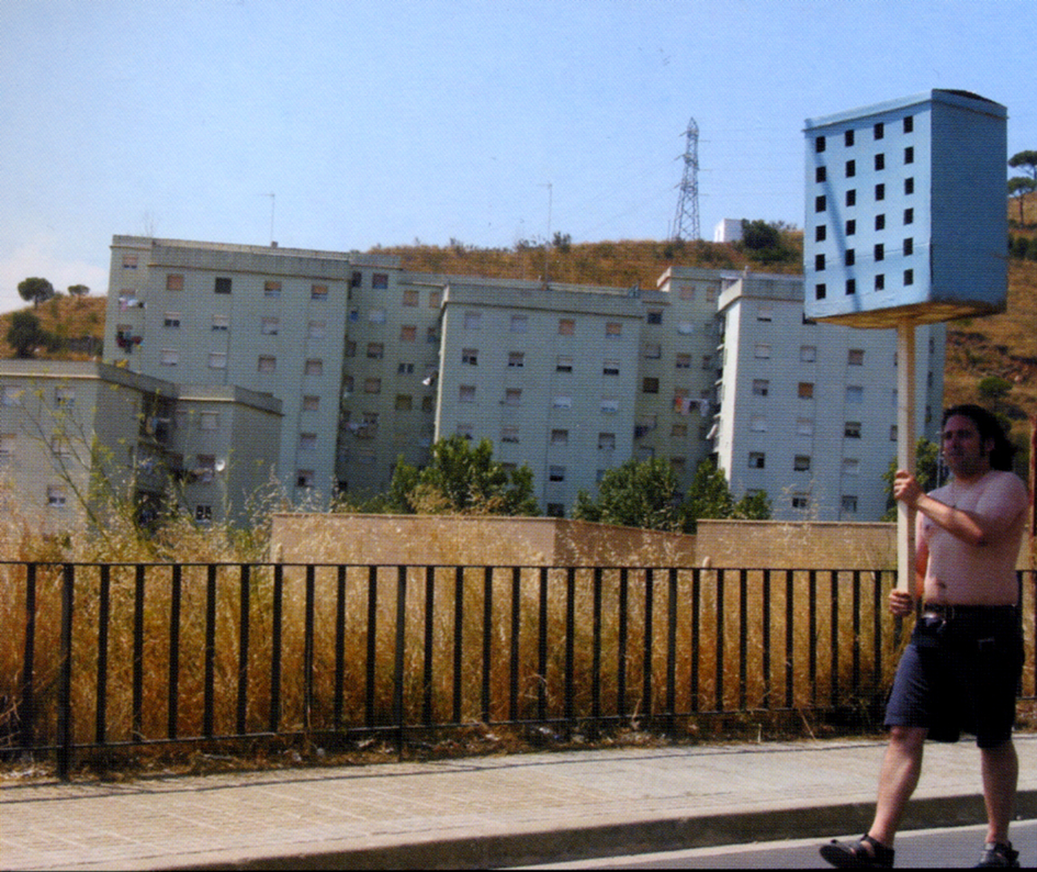 Jordi Colomer spanish visual artist, he lives and works between Barcelona and Paris. Enjoying a gifted and marked sculptural sense, his work spans many mediums, centring on photography, video and the staging of both in exhibition areas. Often the creation of situations -befitting a kind of "expanded theatre"- allows the spectator to assess his/her relationship with the productions and his/her role in and before these. The variety of mediums called forth by Jordi Colomer's work and the transversality of his judgement undoubtedly are linked to his fragmentary education as architect, artist and art historian in progressive 1980s' Barcelona. Since the beginning, Colomer began to fuse his sculptural work, elements of theatre staging and architectural references. A first phase of his work was determined by different urban sets, that led to works such as Anarchitekton (2002-2004), a travelling project. Then he investigated with absurd humour the possibilities of poetic survival offered by the contemporary metropolis. Some of the more recent work do research on the many facets of utopia or dystopia and its relationship with fiction and history.