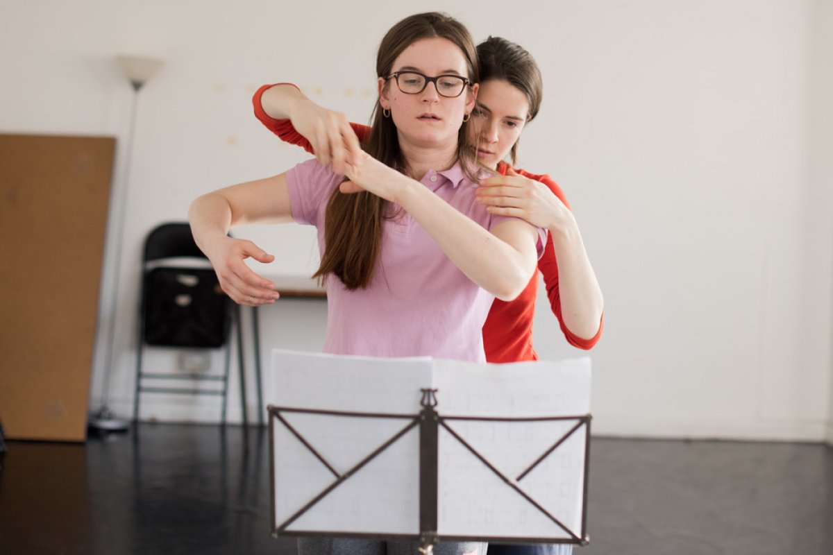 Eleanor Sikorski is a british artist working across dance, performance, music and film. After studying dance, she started making solo performances, using patterns and language to create sequences and recognisable images, inviting common understanding between her and her audience. Flora Wellesley Wesley is a british dancer and actor who has worked with a variety of choreographers, directors and visual artists besides independently and collaboratively producing her own work. She is also in the editorial team of the online performing arts magazine BELLYFLOP. Their desire to dance together, their love of choreographic structures and their critical eye has given them the impetus to invite several distinguished dance makers to create work especially for the duo. Sikorski and Wellesley Wesley invited Burrows and Fargion to create a piece, and they in turn asked them to retranslate Morton Feldman's score For John Cage. The resulting piece looks at the rediscovery and revelation in acts of translation.